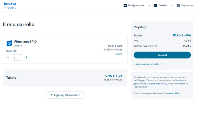 Per prima cosa è necessario procedere all’acquisto del pacchetto “Firma con SPID”: si tratta di un pacchetto composto da un minimo di 3 firme one-shot o multipli di 3. Una volta aggiunto il prodotto al carrello e apposto il flag sull’accettazione dei “Termini e condizioni del servizio”, è possibile cliccare su Aggiungi e vai al carrello.