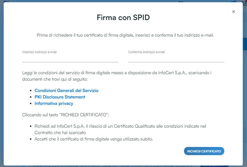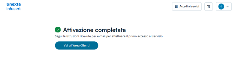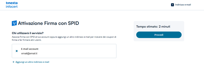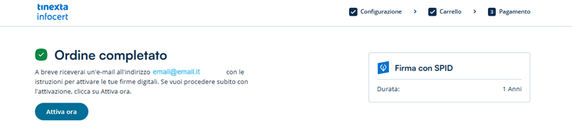 Cliccando sul tasto Attiva il servizio sarà possibile scegliere se associare il certificato sull’indirizzo e-mail con cui è stato effettuato l’acquisto oppure sceglierne uno differente.