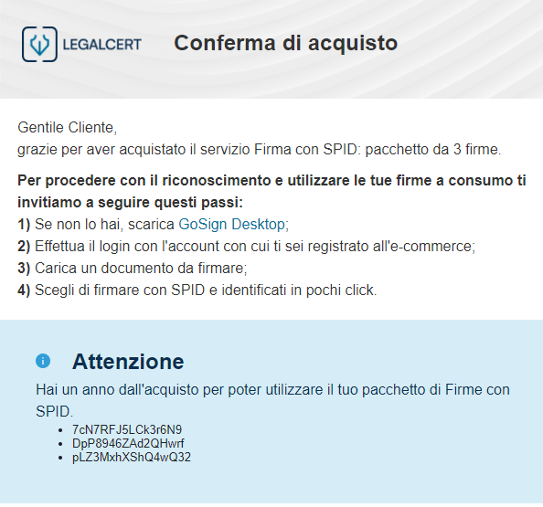 Nel caso si scelga di far utilizzare a terzi le firme, si riceverà una e-mail contente un elenco di coupon anonimi e monouso utilizzabili nel processo di firma, in numero corrispondente a quello di firme acquistate.
