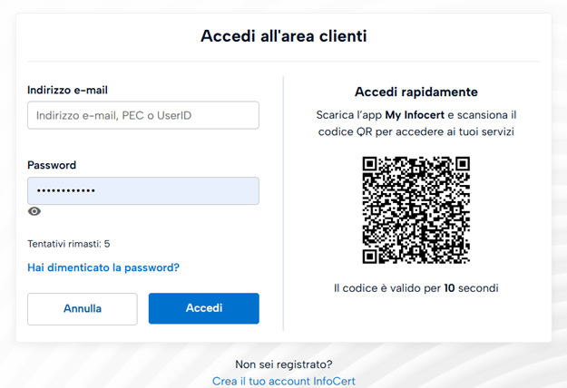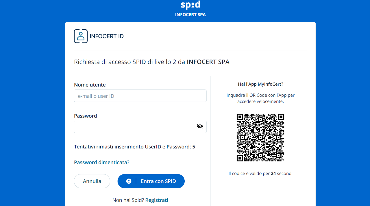 Dopo aver cliccato sul tasto Accedi o registrati sarà necessario inserire il nome utente e la relativa password o, in alternativa, scansionare il Qr-Code tramite l’App MyInfoCert.
