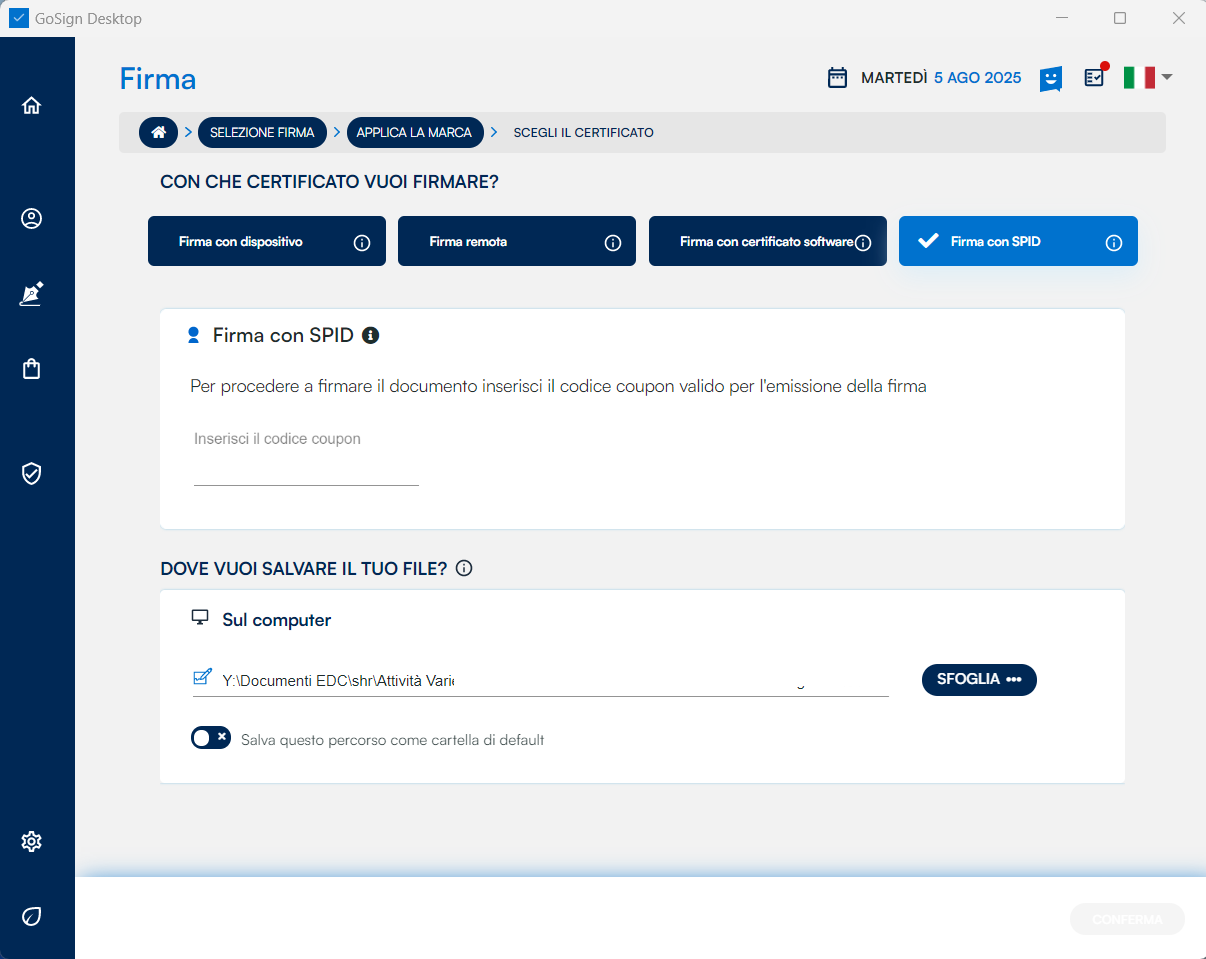 Il passaggio successivo prevede la scelta della cartella di destinazione per il salvataggio del file firmato.