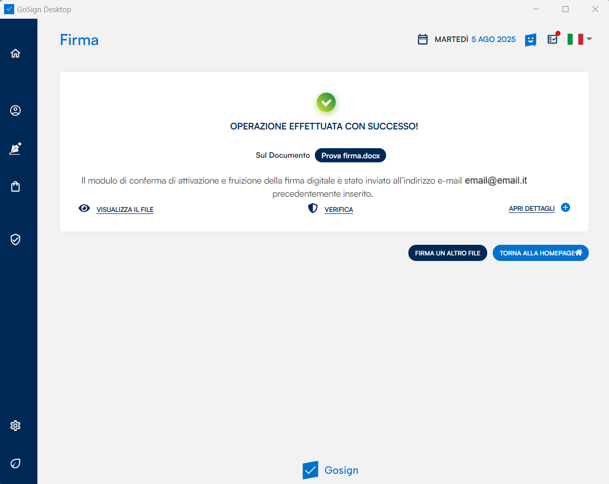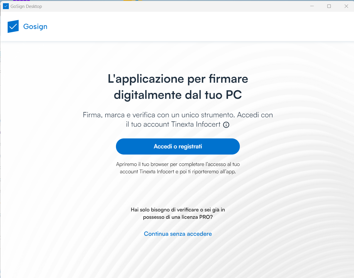 Una volta effettuato correttamente l’acquisto e l’associazione all’account desiderato, sarà possibile procedere con l’accesso a GoSign Desktop.