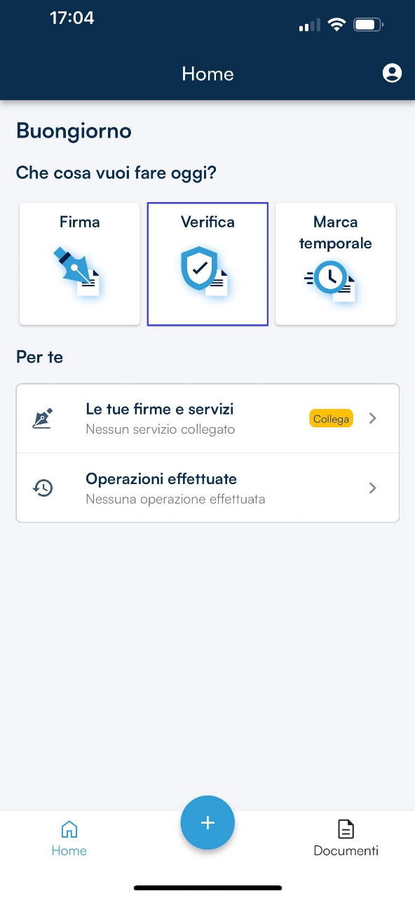 GoSign Mobile mette a disposizione la funzione Verifica nella homepage. Con un clic sulla sezione Verifica sarà possibile selezionare il documento firmato e/o marcato da verificare.