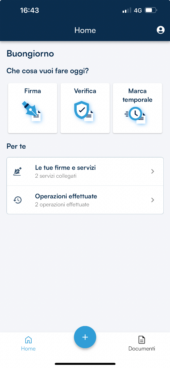 La selezione dell’icona avvia GoSign (Mobile) e permette di avere a disposizione la pagina iniziale dell’App dalla quale selezionare l’attività che occorre: