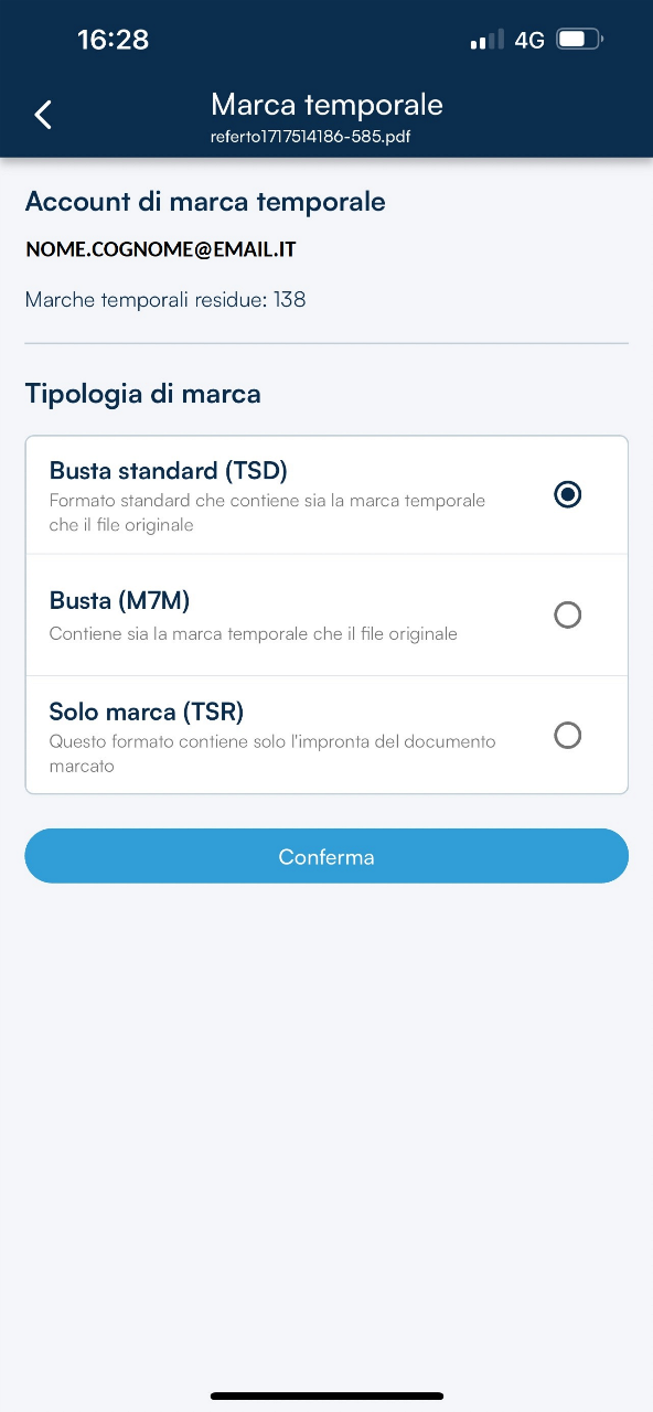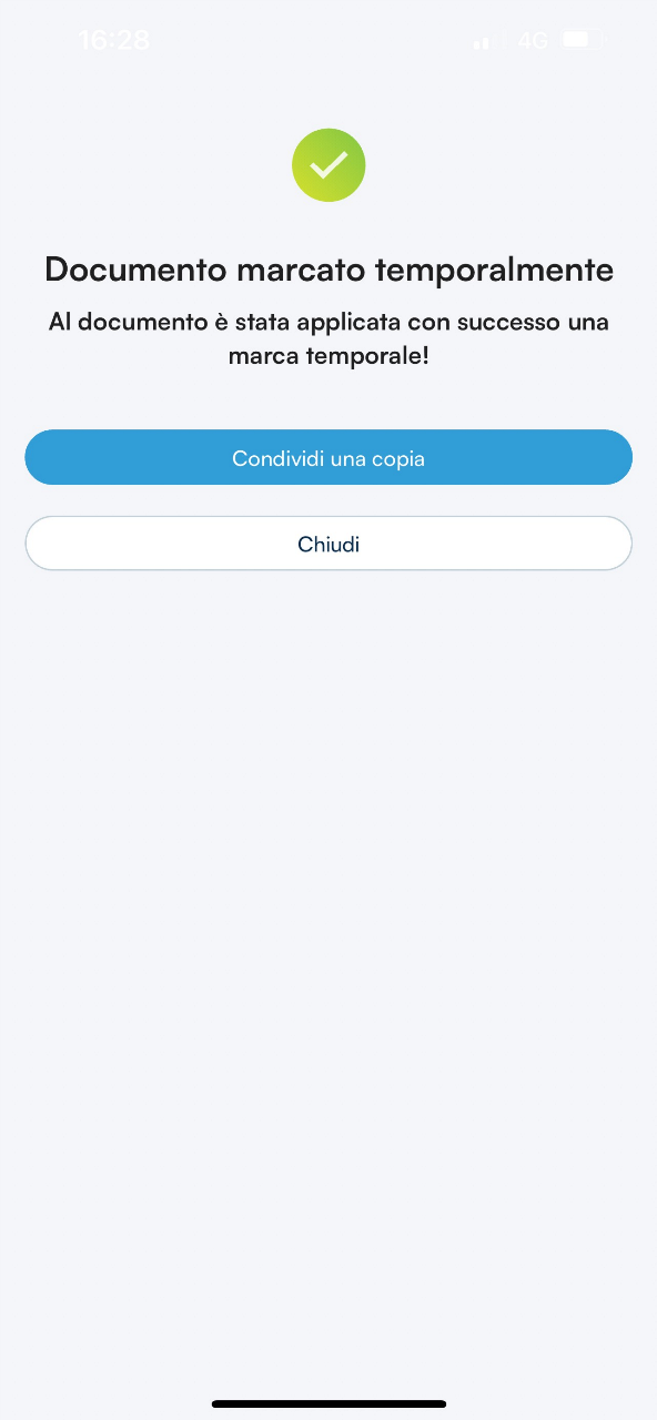 Una volta individuata la tipologia di marca temporale che si intende apporre al documento, non resta che selezionare l’opzione corrispondente e continuare con un clic sul tasto Conferma. Al termine dell’operazione, GoSign Mobile confermerà il buon esito dell’operazione.