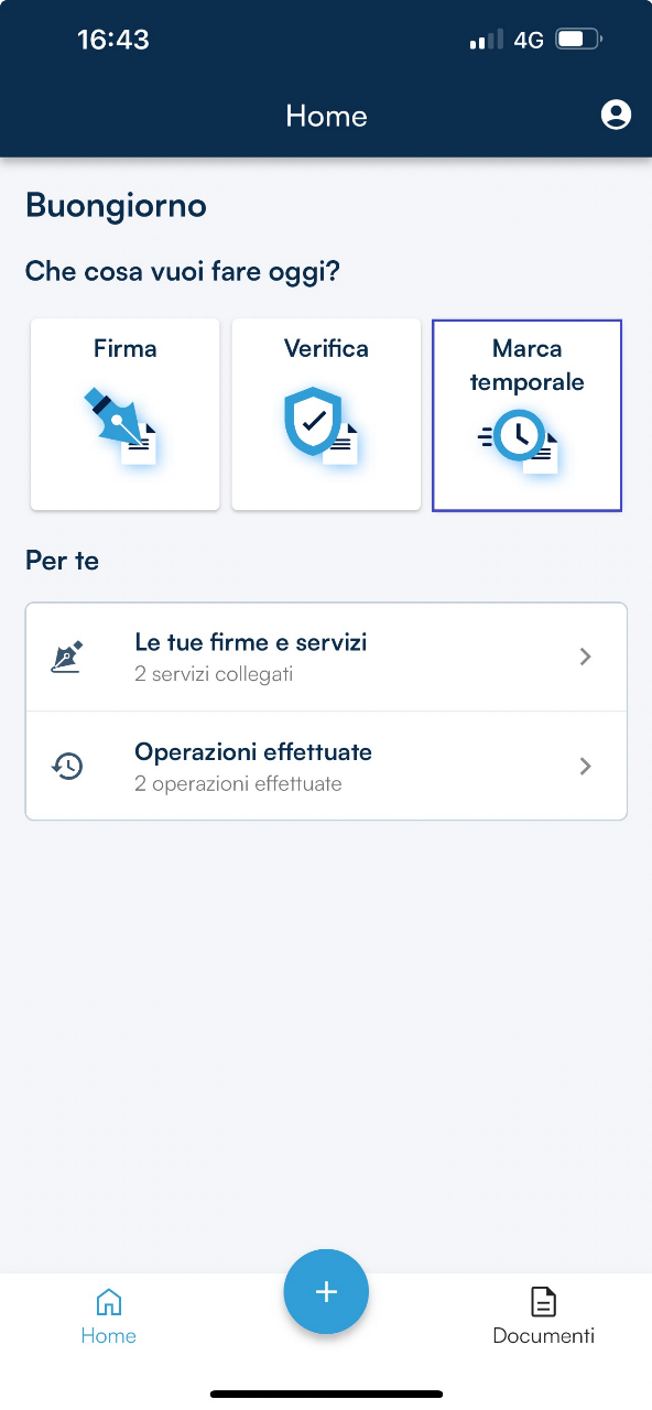 E’ possibile raggiungere i documenti da sottoporre alla marcatura dalla sezione Marca Temporale o cliccando sull’icona +, opzioni presenti nella homepage dell’App GoSign Desktop.