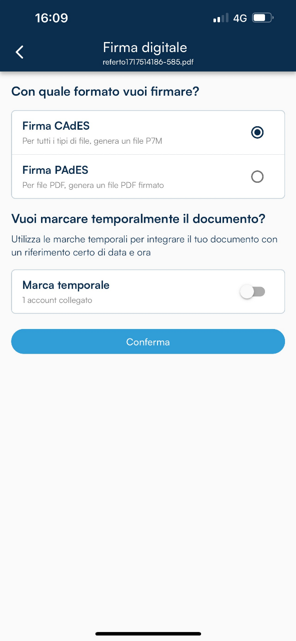 Inoltre, se è stato collegato GoSign Mobile al servizio di marca temporale, al momento della firma sarà possibile aggiungere una marca temporale selezionando l’opzione Marca temporale.