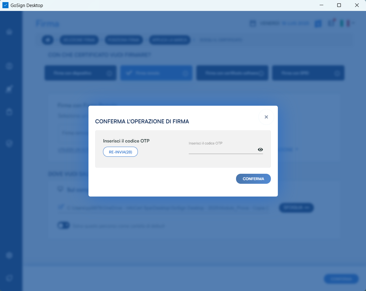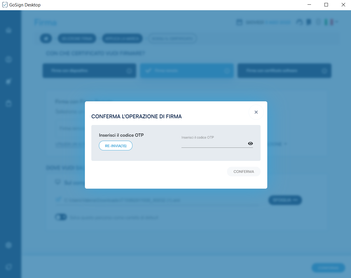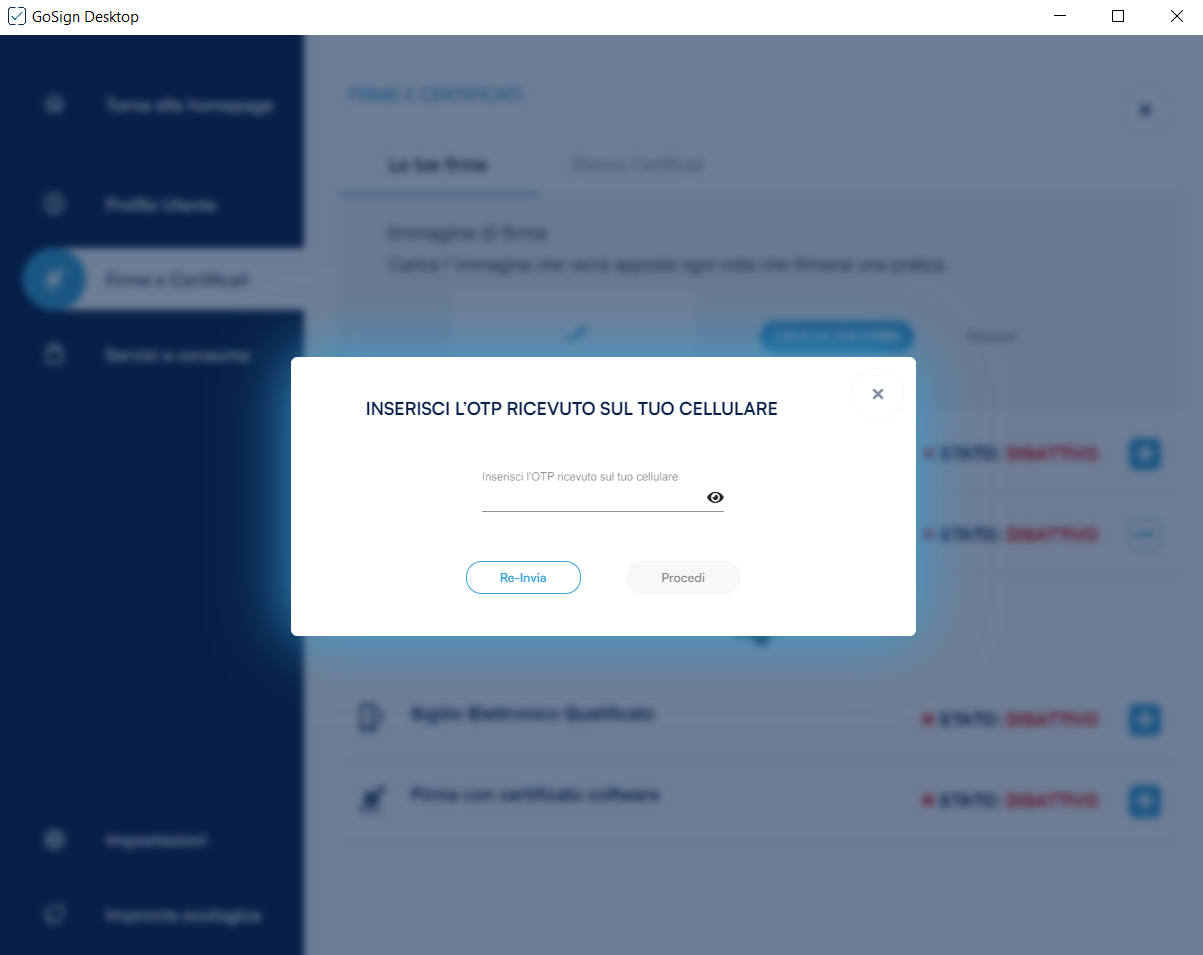Nella fase successiva, GoSign Desktop PRO mi chiede di convalidare l'operazione attraverso la digitazione del codice OTP ricevuto via sms al numero collegato alla mia utenza.