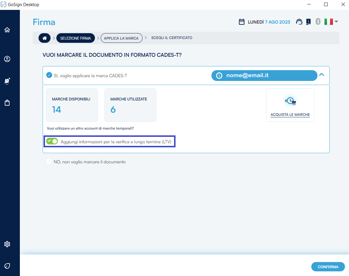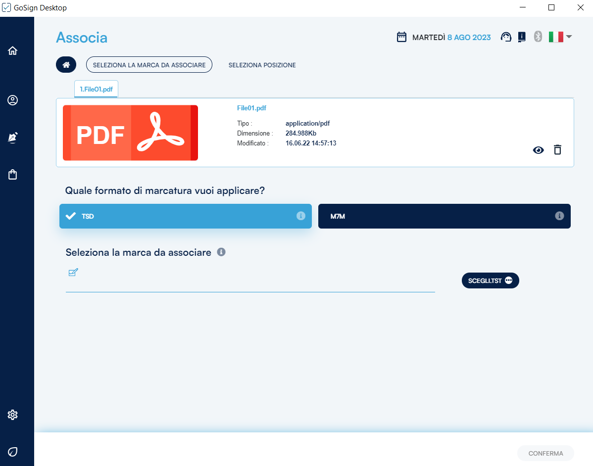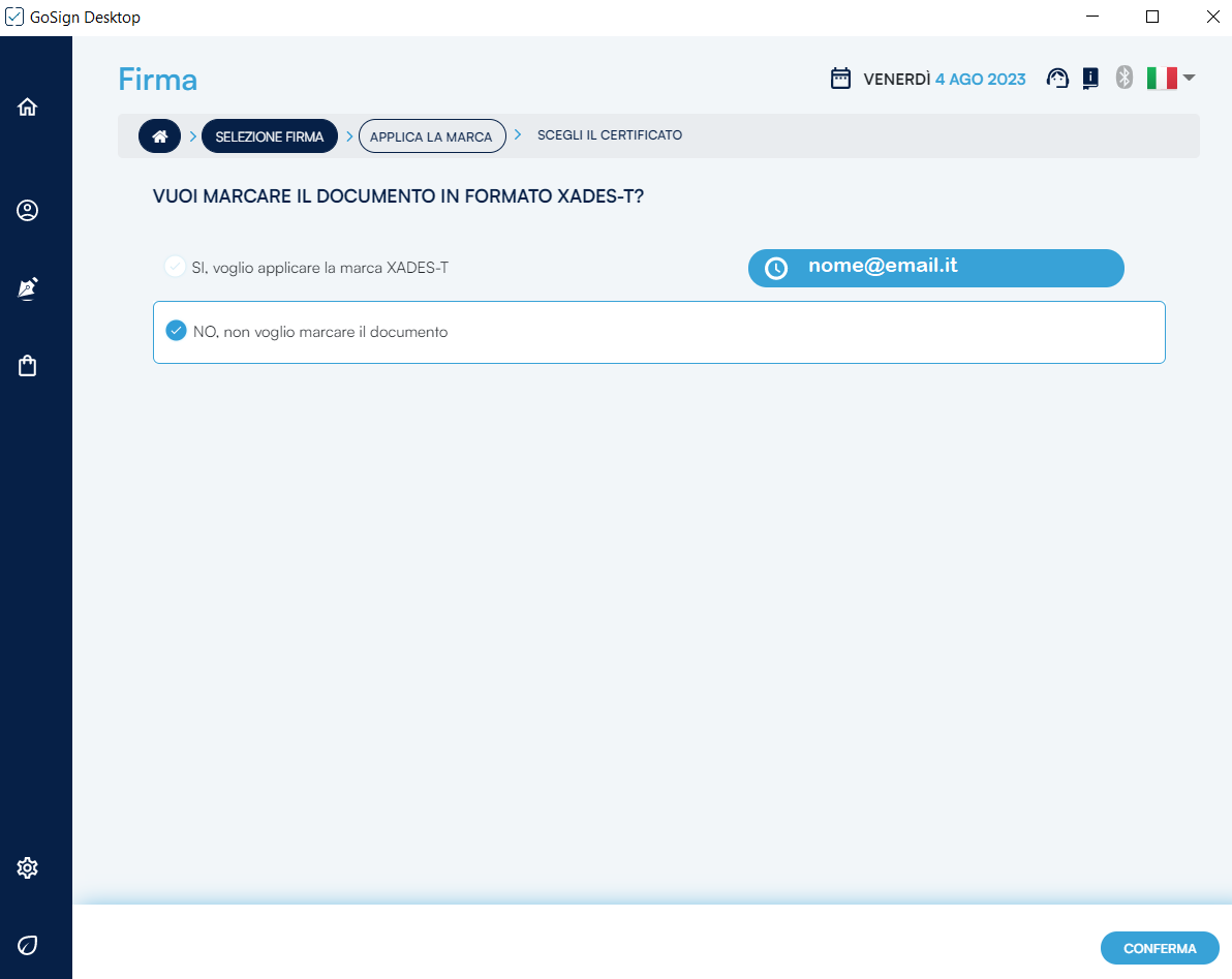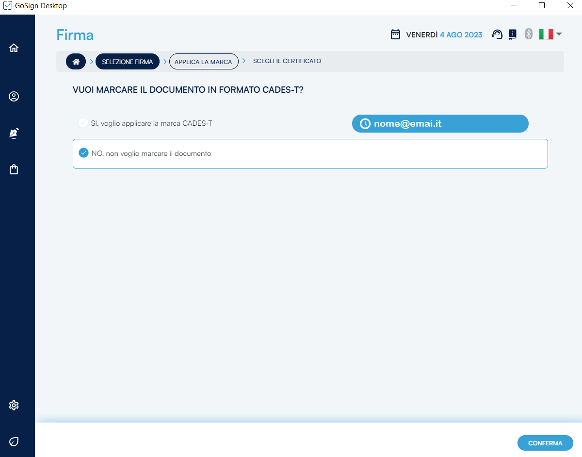 Una volta scelto se si voglia o meno apporre una marca temporale è necessario premere sul pulsante Conferma per procedere alla fase successiva.