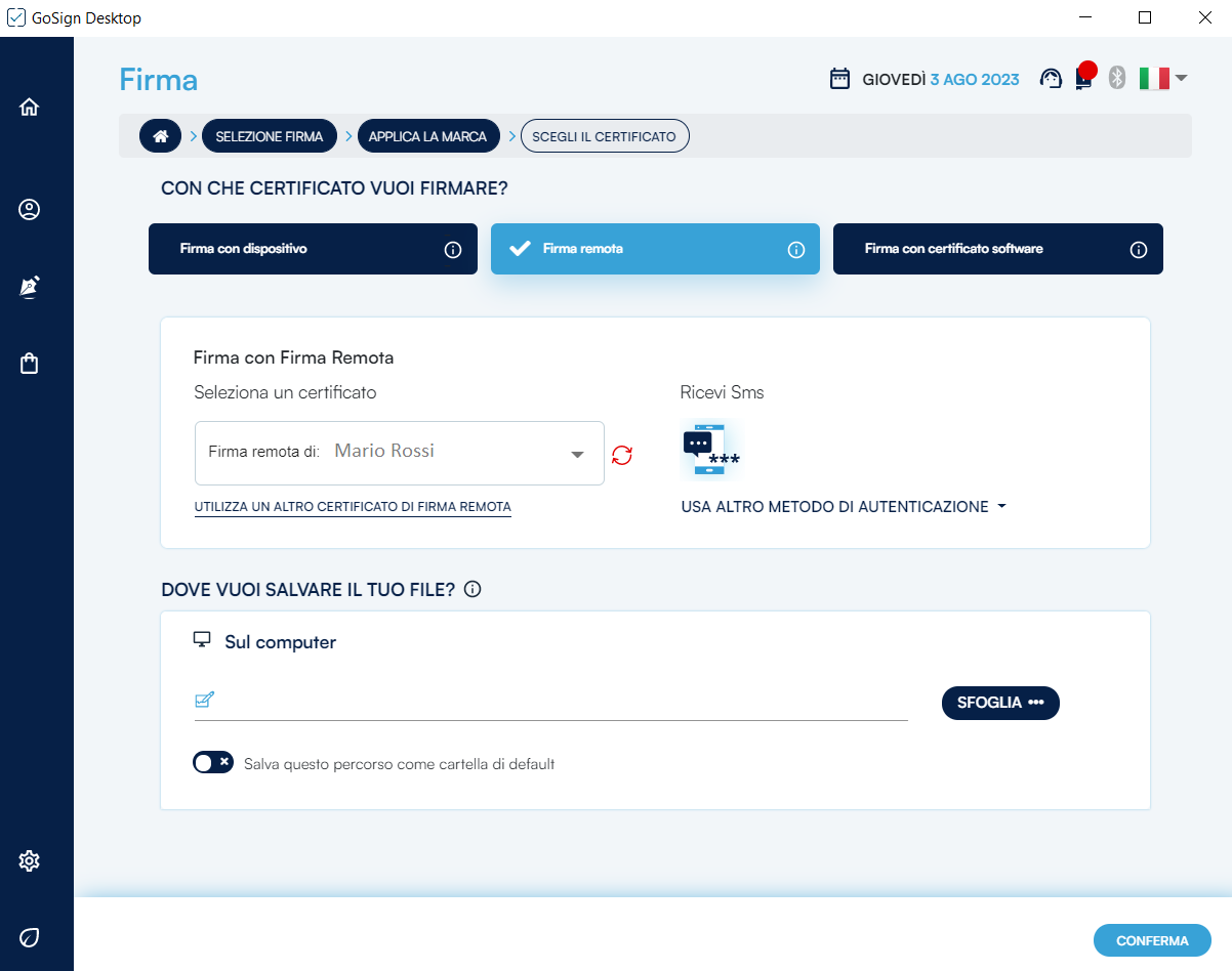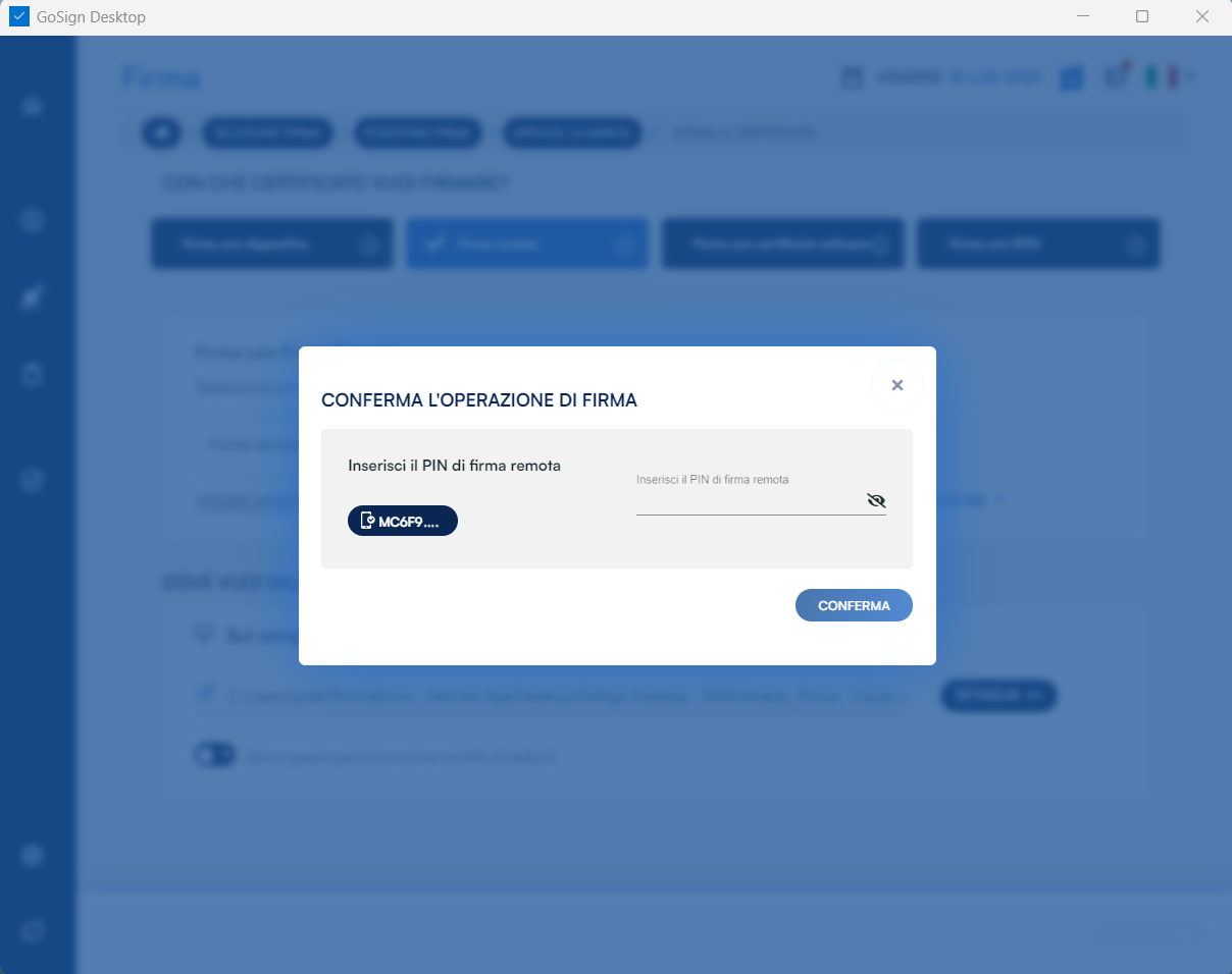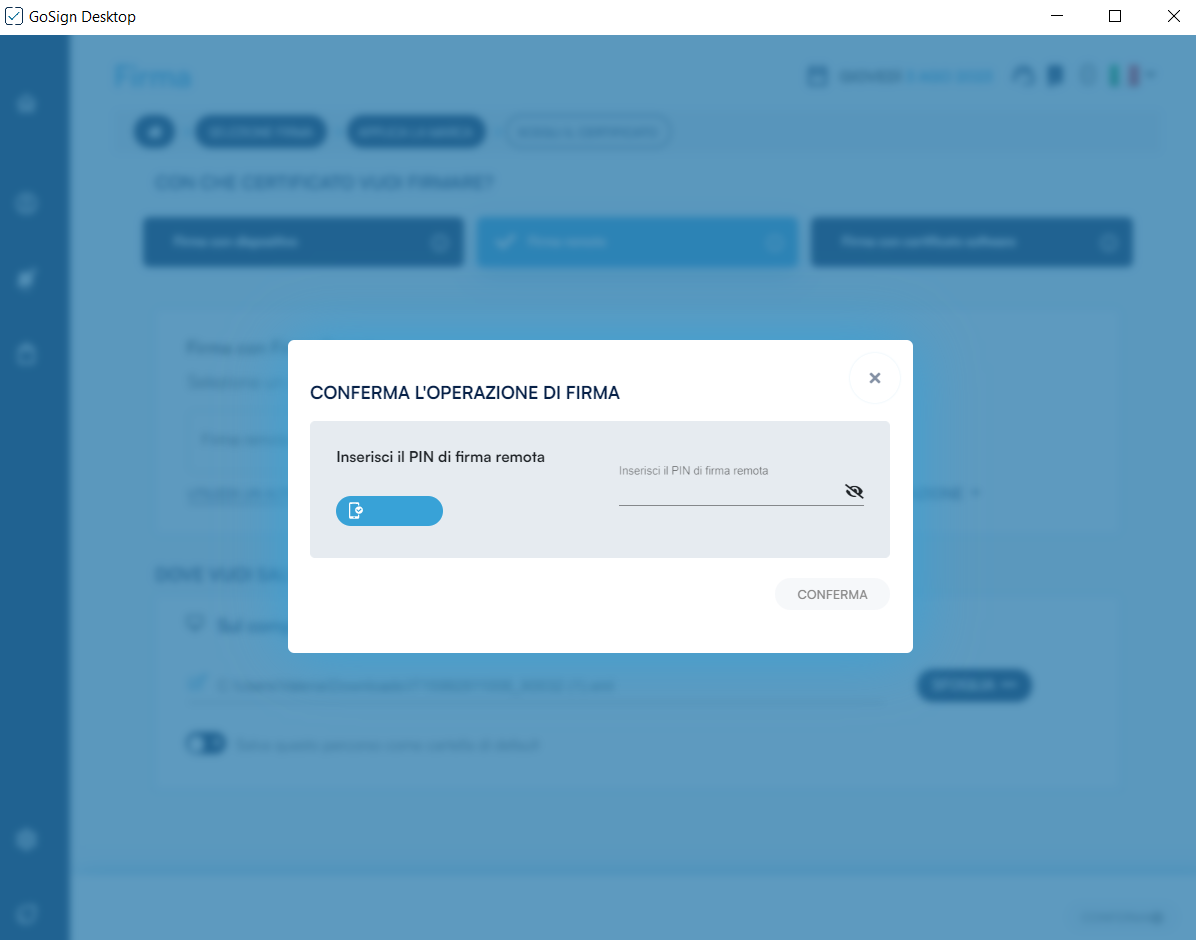 Come le altre modalità, GoSign Desktop PRO propone un possibile percorso nel campo di destinazione di salvataggio, che coincide con la sovrascrittura del documento originale venendo cosi sostituto dal documento firmato. Cliccando su Conferma verrà richiesta, tramite finestra popup, la password relativa al certificato.