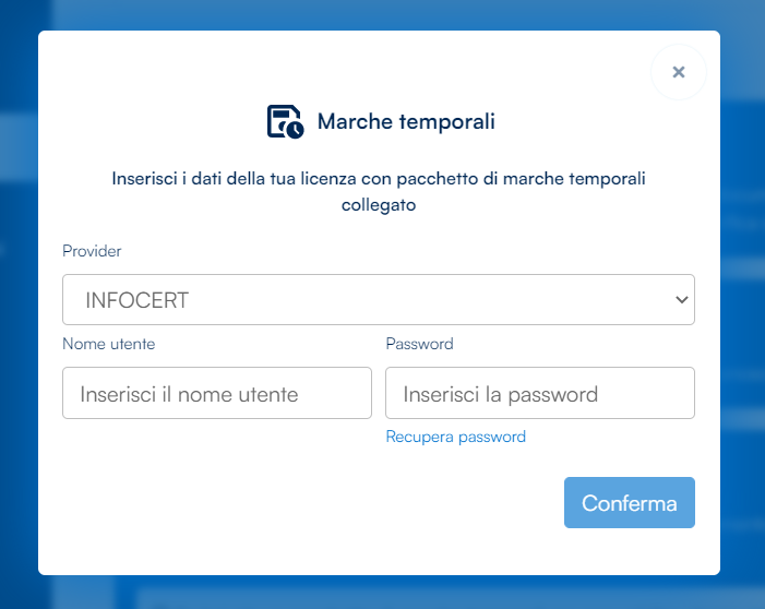 Per l’applicazione di una Marca è necessario che sia configurato un account contenente le marche temporali, se non fosse già stato configurato aprendo il menù laterale e scegliendo l'opzione Servizi a consumo sarà possibile inserire le credenziali dell'account legato alle marche temporali.
