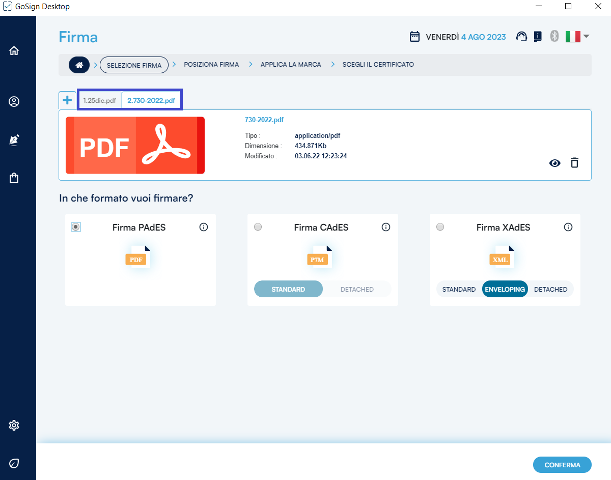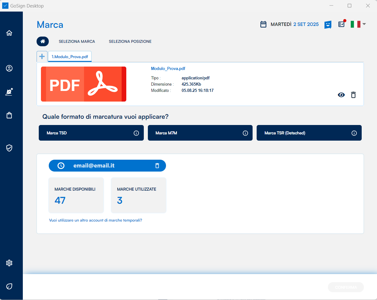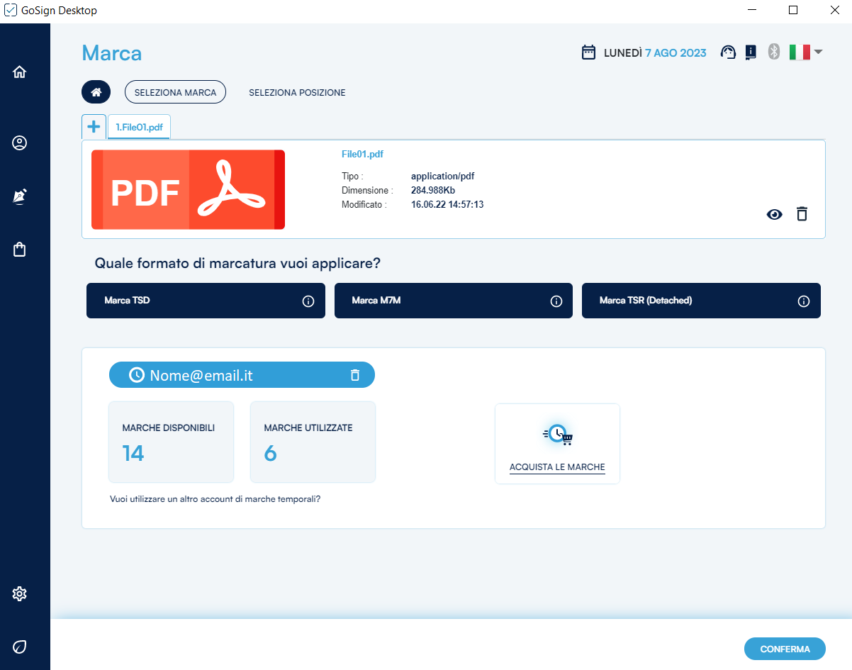 GoSign Desktop PRO mi presenta gli estremi dei documenti che sto per marcare (nome, tipo) e i possibili formati di marcatura che posso eseguire a loro carico. Dopo aver identificato il formato di marcatura che mi occorre, procedo con un clic sul pulsante Conferma.