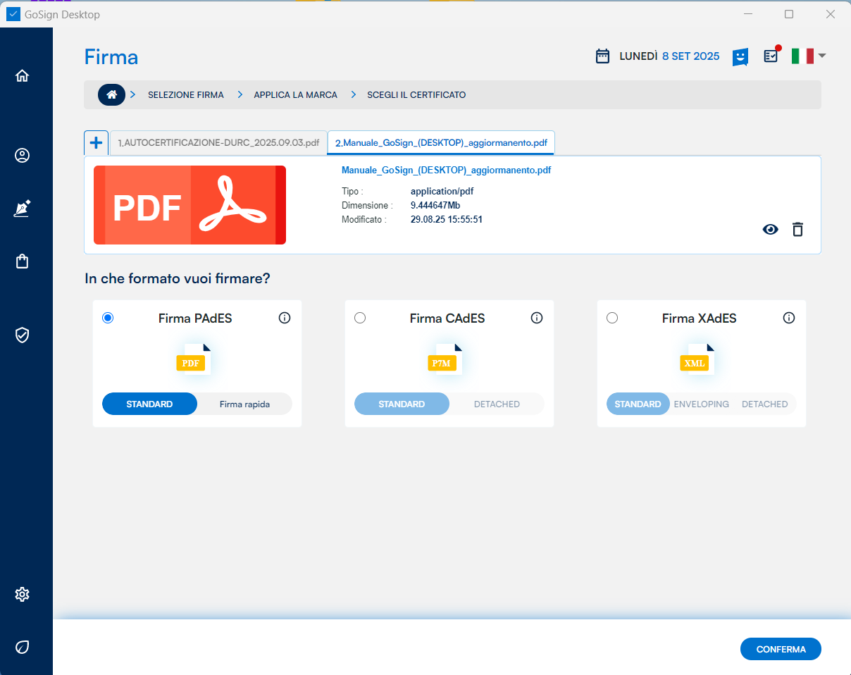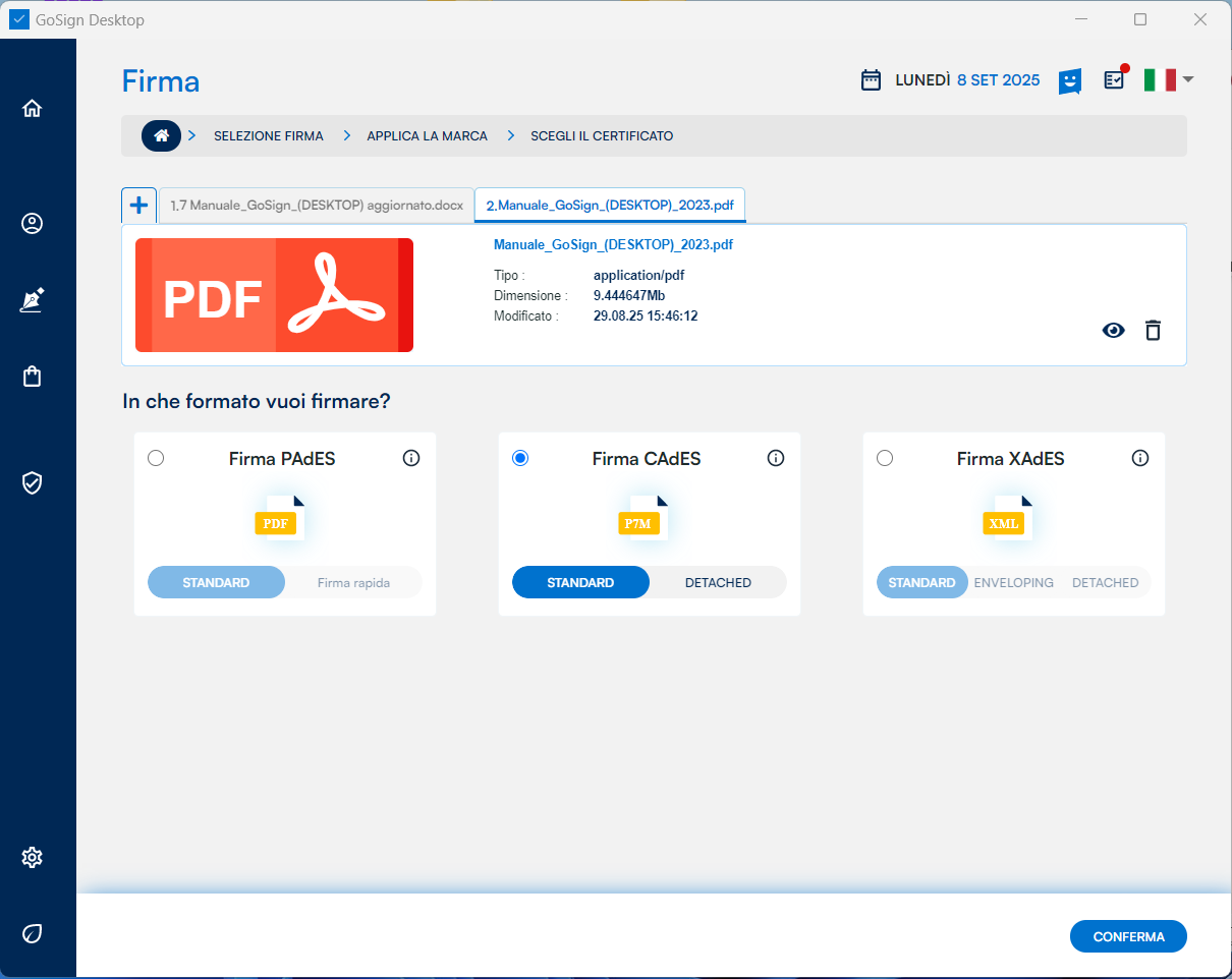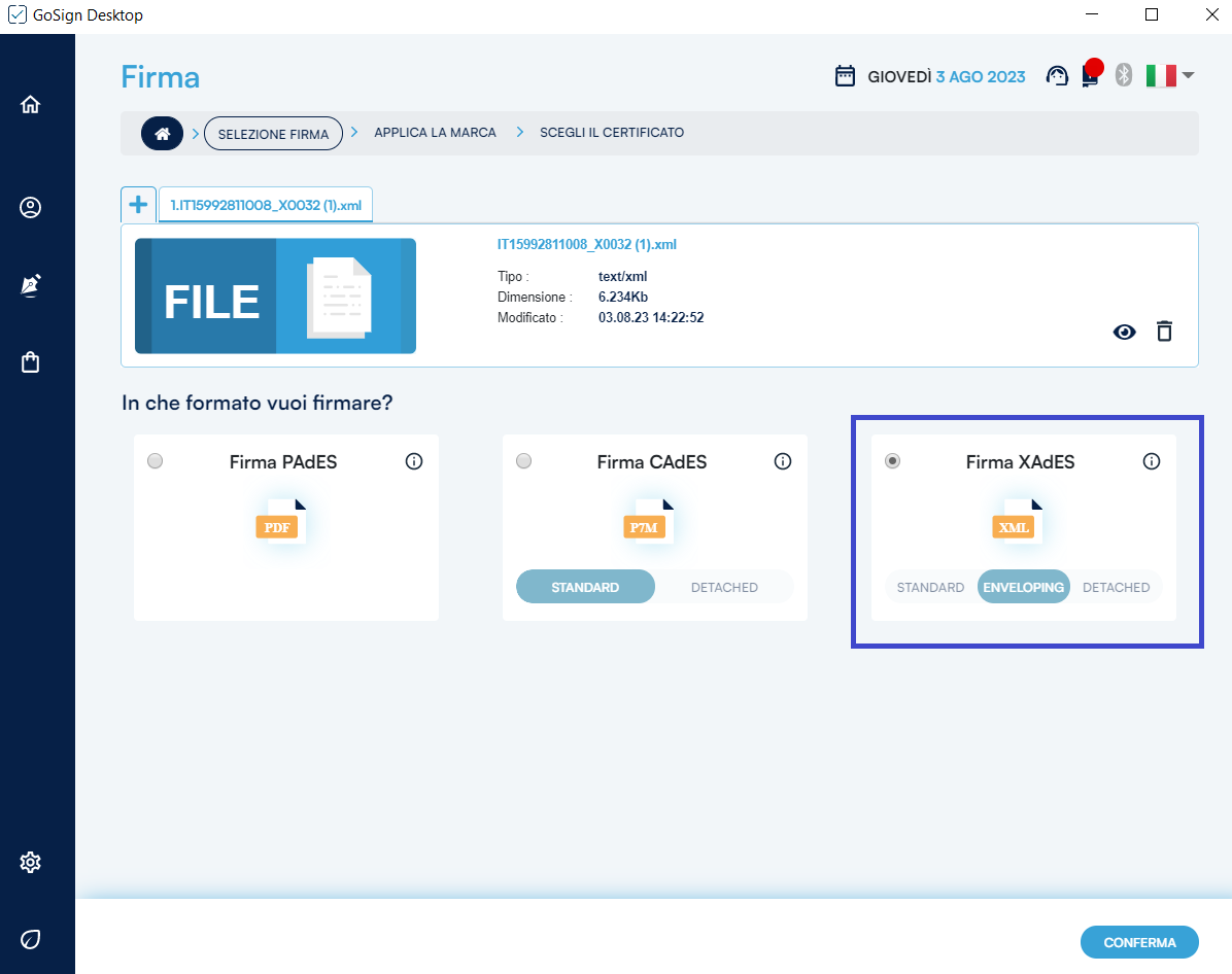 GoSign Desktop PRO mi presenta gli estremi dei documenti che sto per marcare (nome, tipo) e i possibili formati di marcatura che posso eseguire a loro carico. Dopo aver identificato il formato di marcatura che mi occorre, procedo con un clic sul pulsante Conferma.
