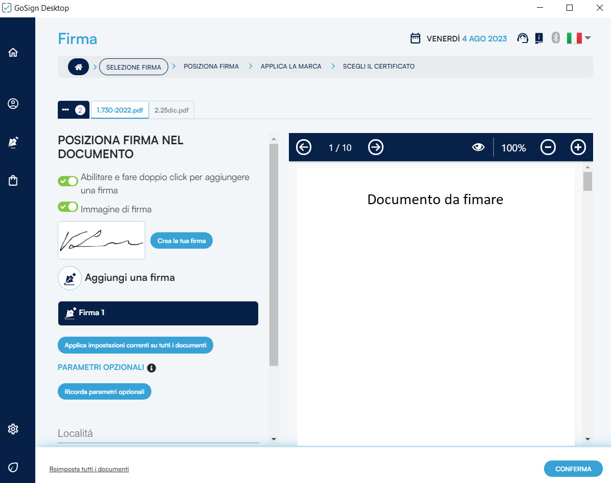 Selezionando la firma selezionata si potrà procedere cliccando su Conferma.