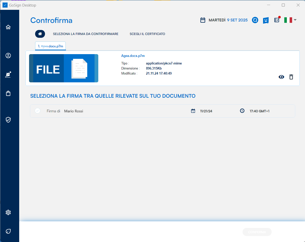 Successivamente, GoSign Desktop PRO presenta gli estremi del documento (tipo, dimensione, ecc.) e qualora venisse ritenuto necessario, è messo a disposizione il pulsante Apri documento (indicato dall'icona dell'occhio) per visualizzarlo e la funzione Elimina (indicata dall'icona del cestino). Viene poi mostrato l'elenco di tutte le firme presenti nel documento e data la possibilità di selezionare le firme che si intende controfirmare. Una volta selezionata per continuare posso proseguire cliccando sul tasto Conferma.