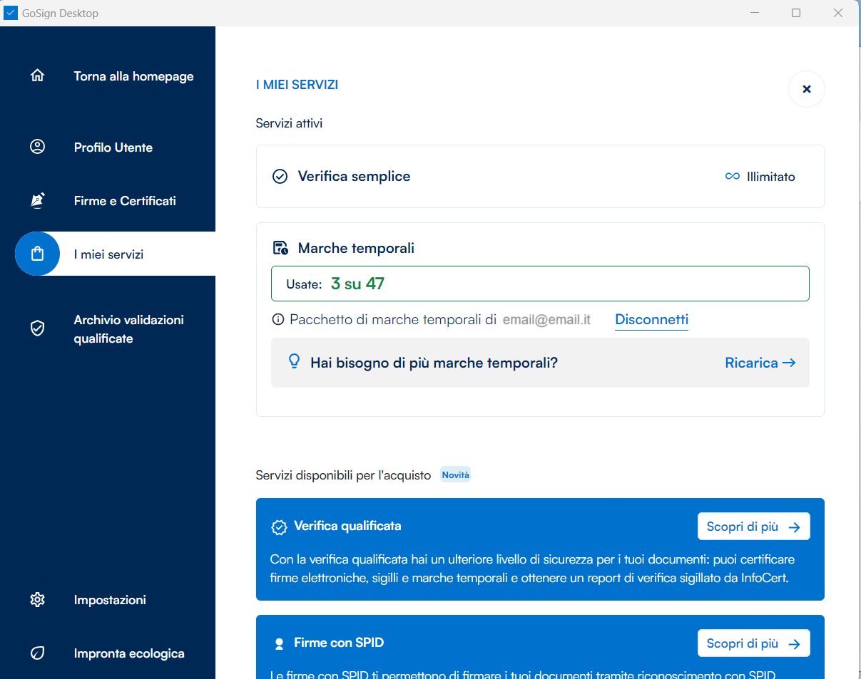Prima di iniziare il processo di marcatura vero e proprio, verifico di avere a mia disposizione un congruo numero di marche temporali ricorrendo alla funzione di configurazione, raggiungibile dal menu laterale Servizi a consumo.