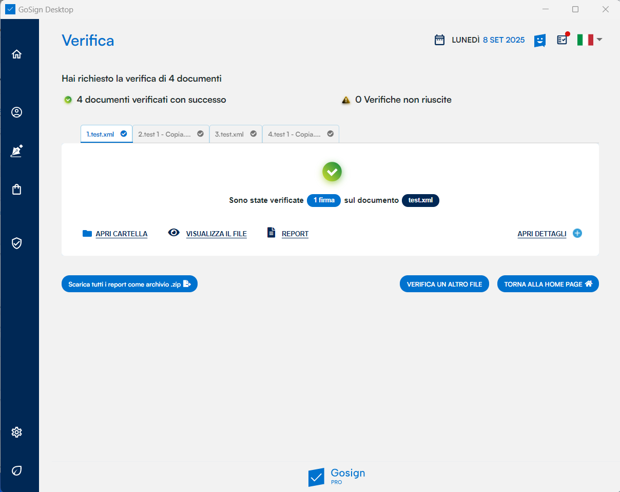 GoSign Desktop PRO mi permette di verificare la validità dei documenti con firma LTV, indipendentemente dallo standard della firma apposta ai documenti (CAdES o PAdES). Dopo aver selezionato i documenti ricevo una risposta che è diretta e consiste in una sintesi dell’esito di verifica. Seguendo i link Apri Dettagli arriverò sul pannello di verifica di ciascun singolo documento.