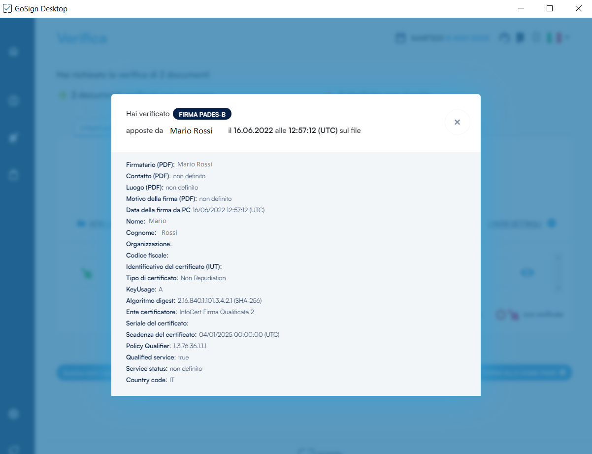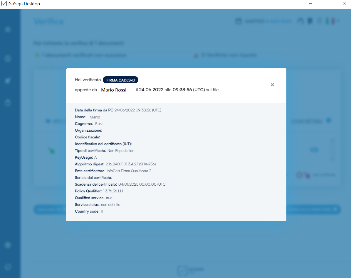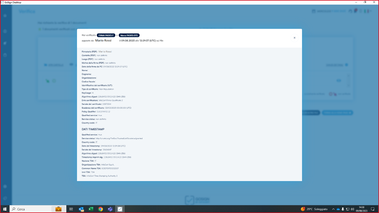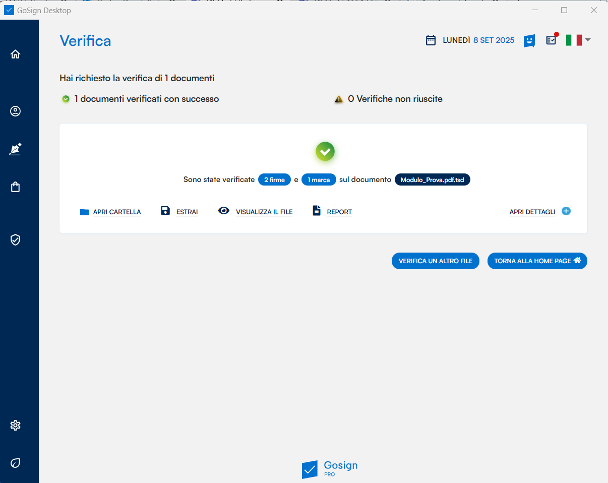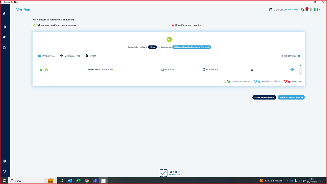 La risposta di GoSign Desktop PRO è diretta e consiste in una sintesi dell’esito di verifica.