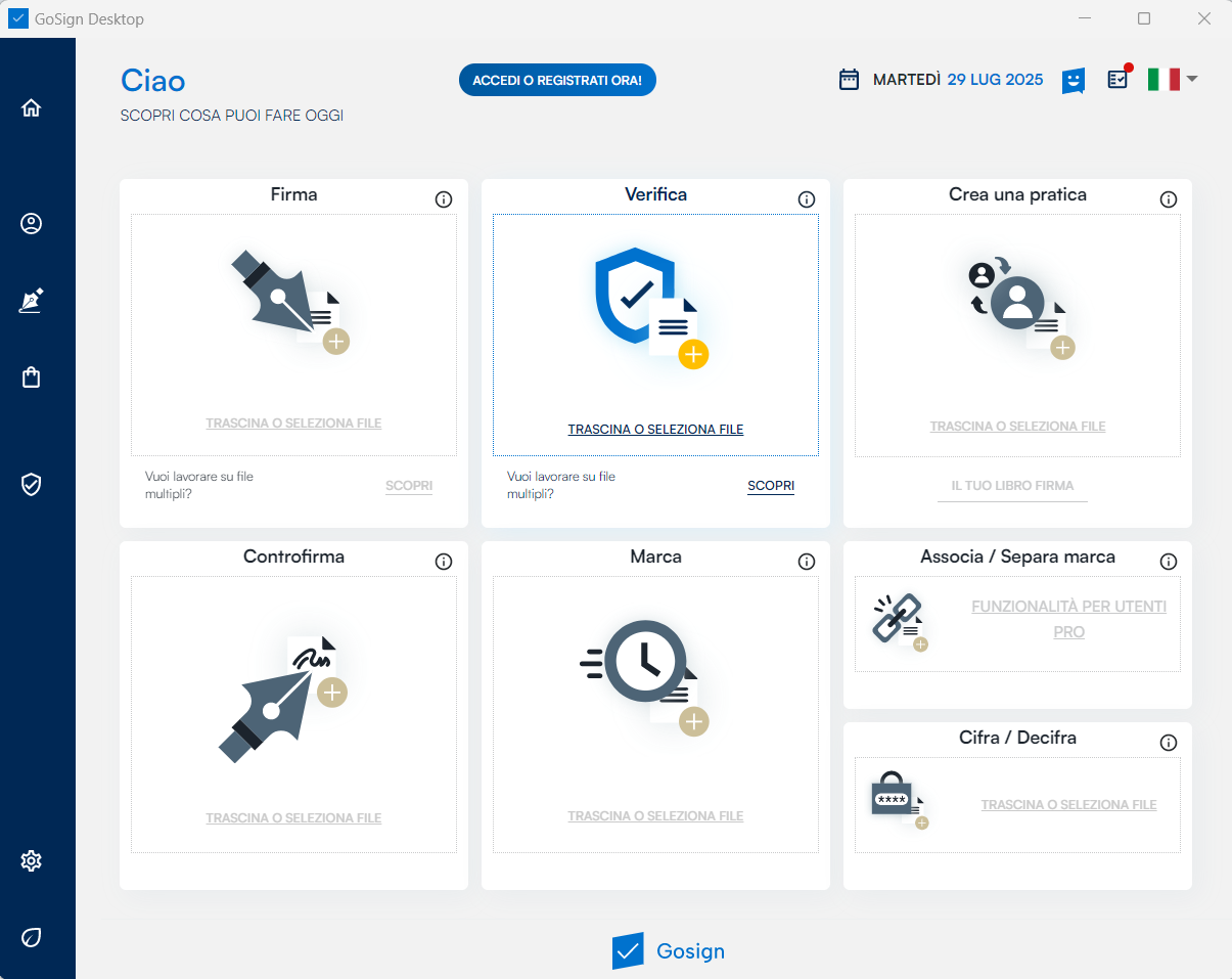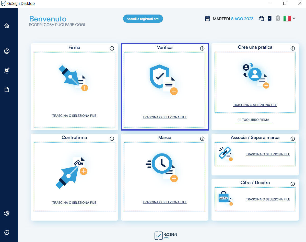 Analogamente alla versione gratuita del software (alla cui guida si rimanda per maggiori dettagli), GoSign Desktop PRO mi permette di firmare, marcare nonché di verificare la validità della firma o della marca temporale.