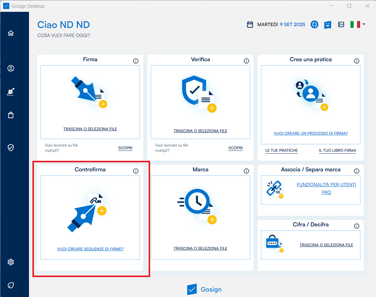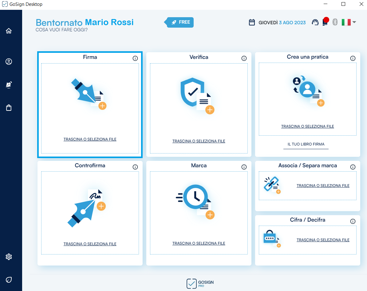 GoSign Desktop PRO mette a disposizione nella home page la funzione Firma che mi permette di selezionare il documento da firmare e di richiamarlo all’interno del software.