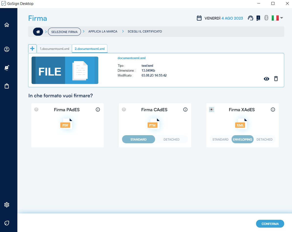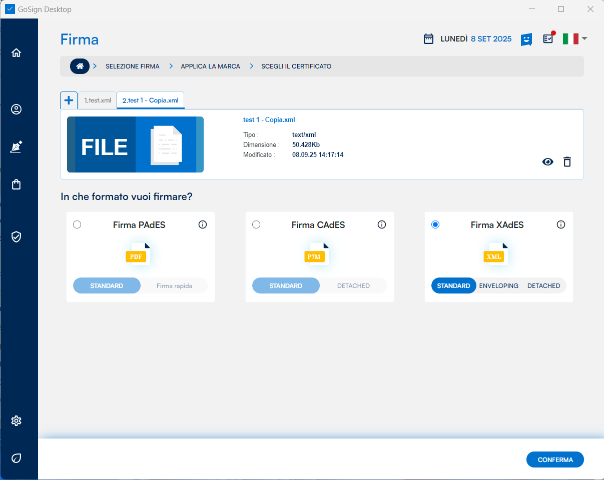 GoSign Desktop PRO mi informa che i miei documenti firmati manterranno l’estensione .xml, cioè la firma sarà a standard XAdES.