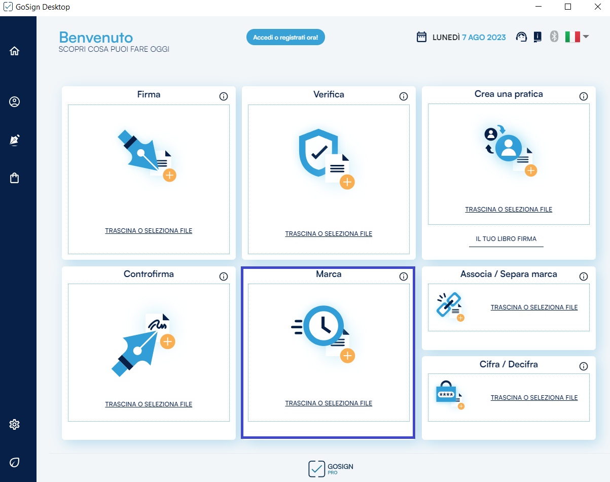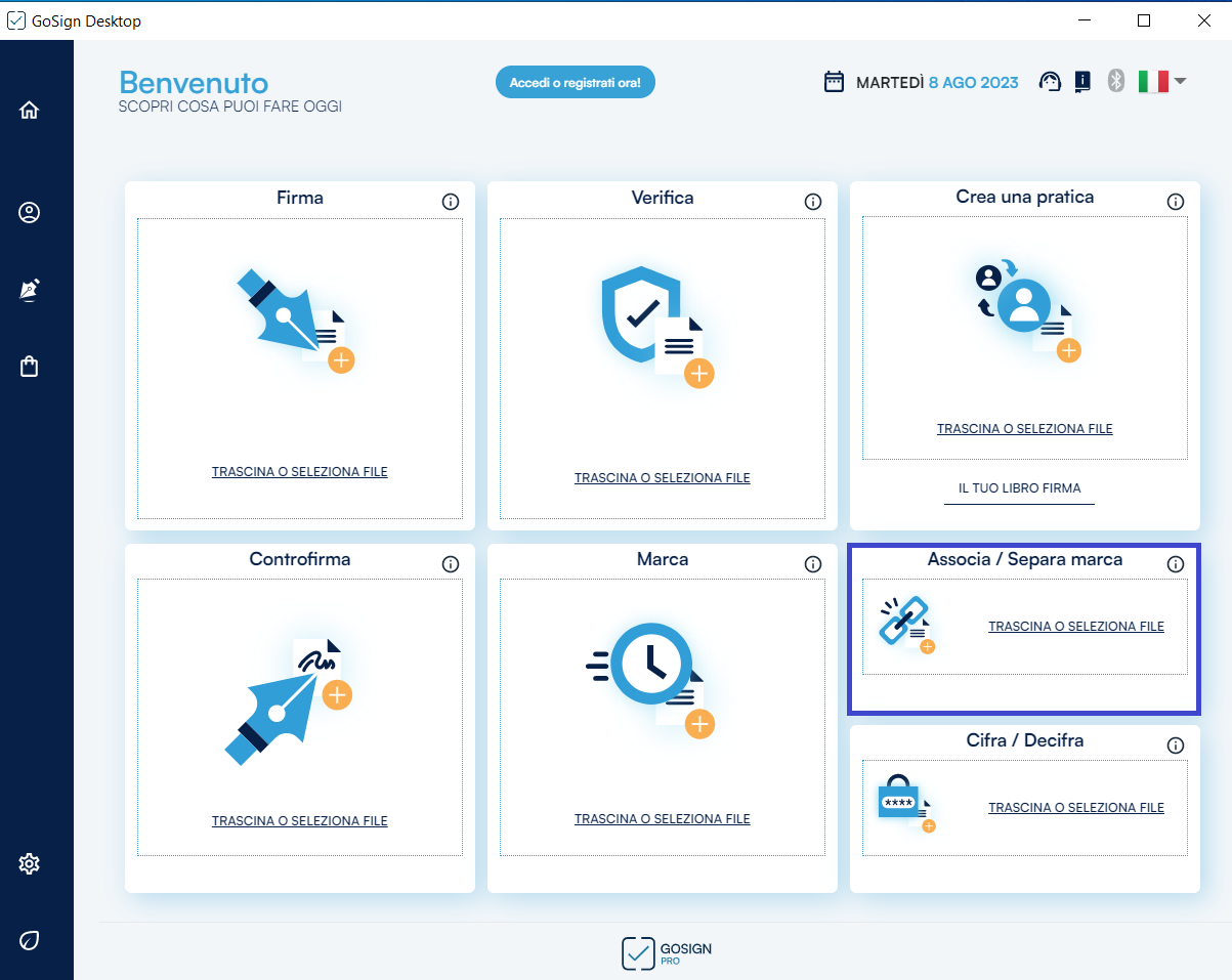 Poiché sto utilizzando GoSign Desktop PRO, ho a disposizione le opzioni Marca, Associa e Separa che mi permettono, rispettivamente, di selezionare il documento da marcare richiamandolo all’interno del software, di associare un documento alla sua marca temporale detached e di separare una marca temporale dal documento cui è associata.