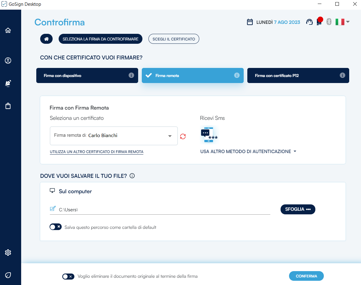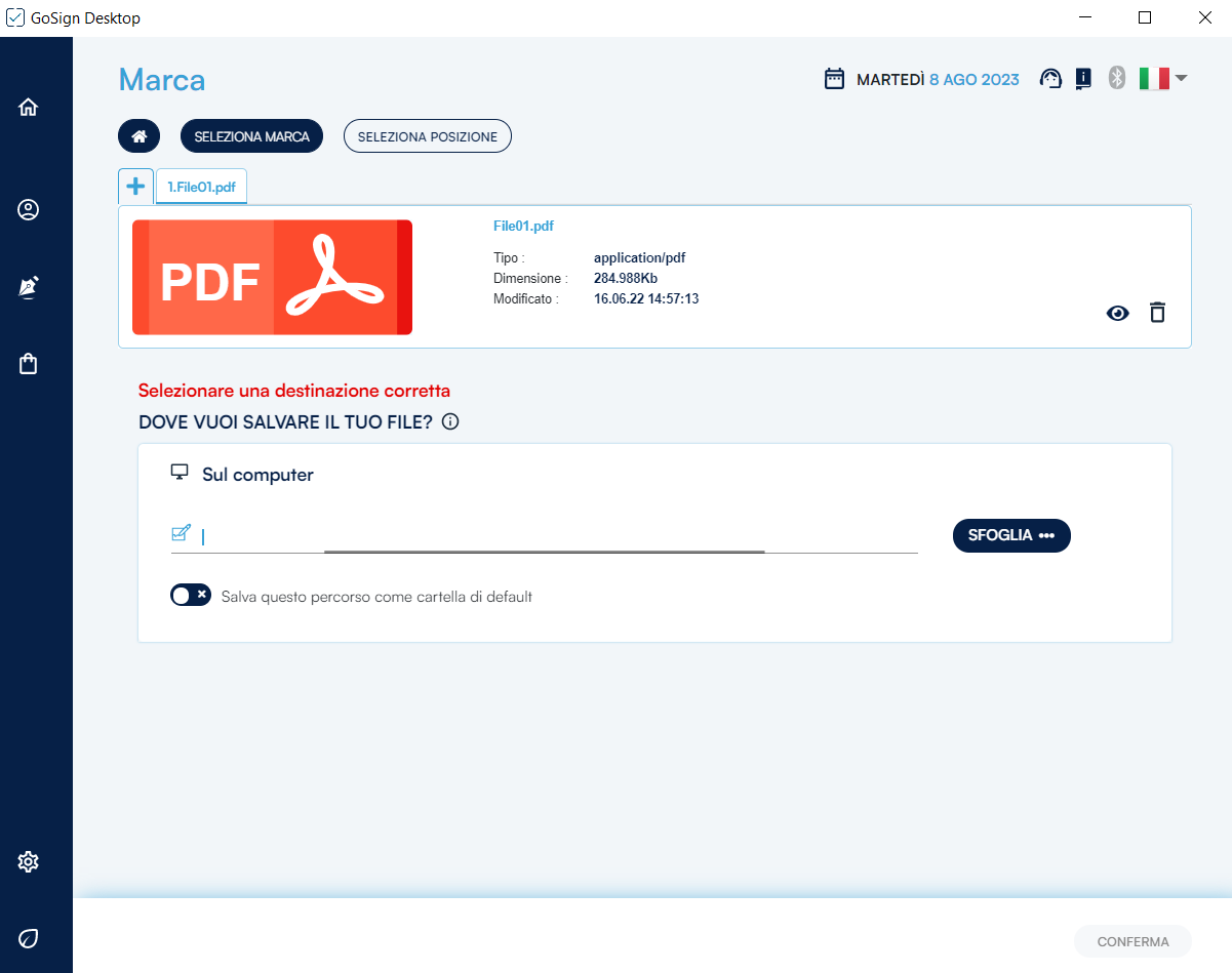 Di default, GoSign Desktop PRO propone un possibile percorso nel campo di destinazione di salvataggio, che coincide con la sovrascrizione del file originale venendo cosi sostituto dal documento firmato.