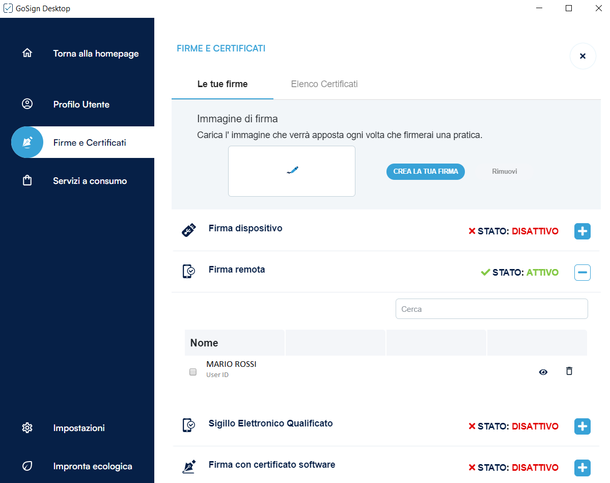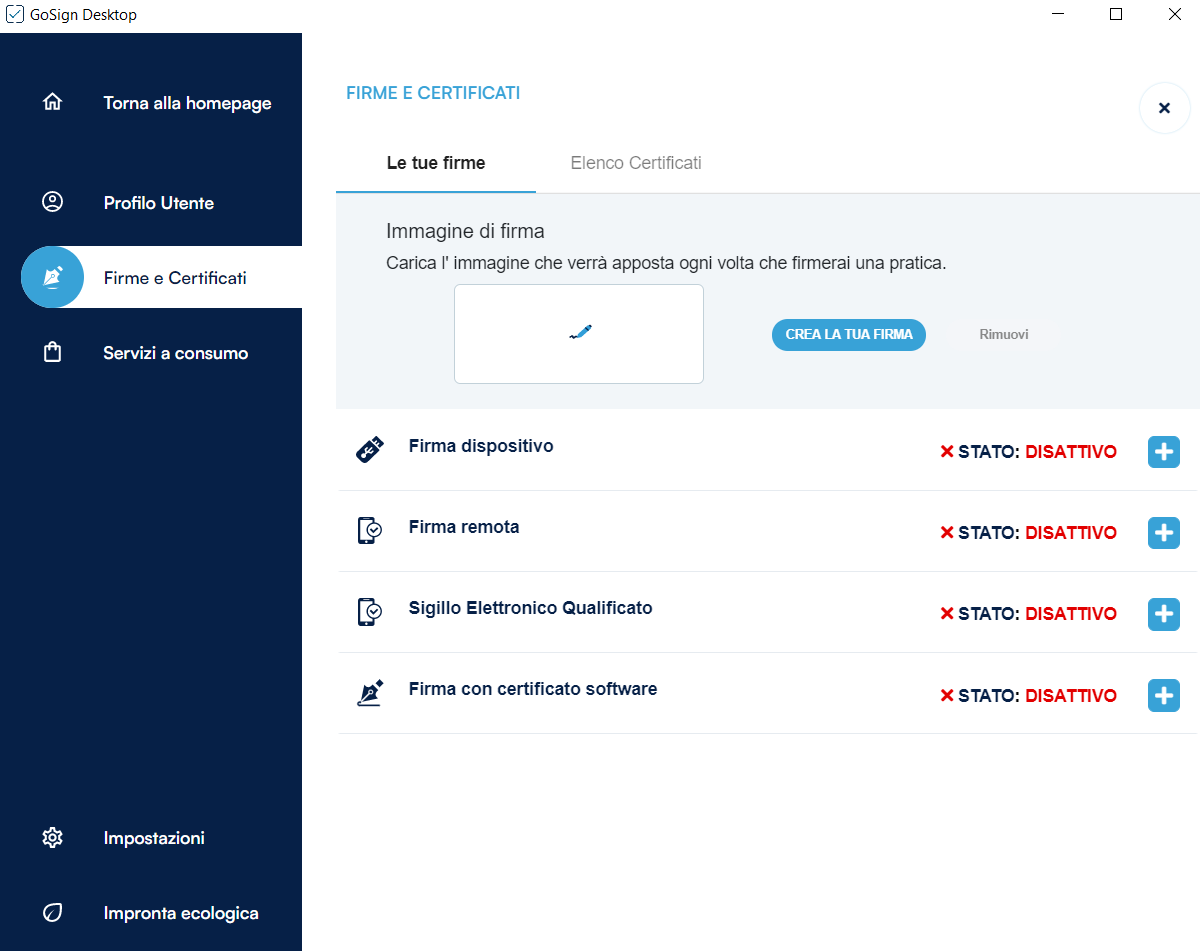 All'interno di questa sezione ho la possibilità di visualizzare le diverse tipologie di firma e di inserire le credenziali relative alla mia firma remota, cliccando sull’icona del “+”.