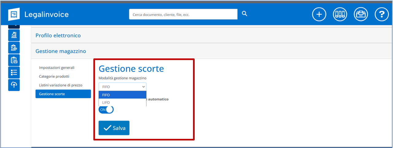 E decidere la modalità di gestione del magazzino (LIFO o FIFO)
