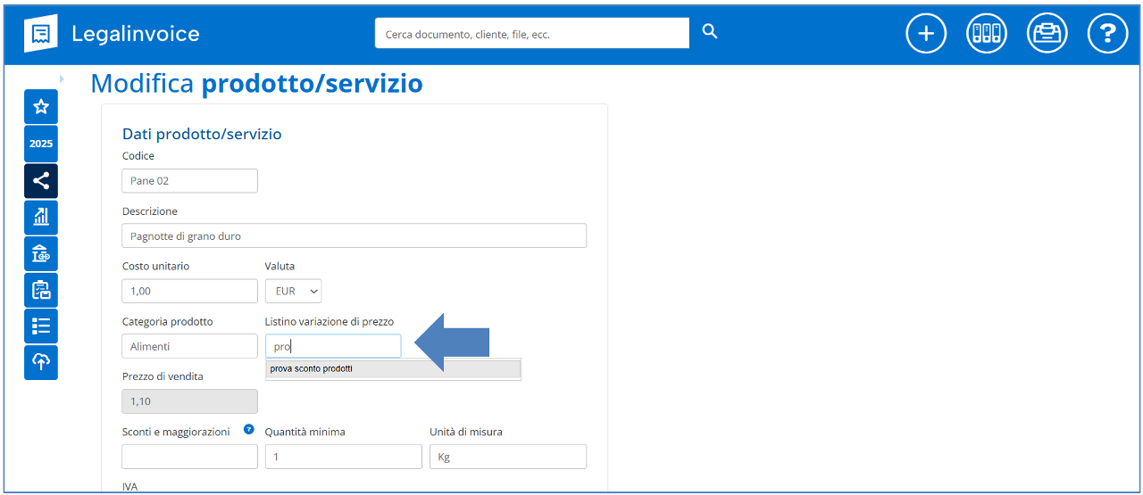 E’ possibile abbinare un listino ad un prodotto/servizio e/o ad un cliente memorizzandolo sull’anagrafica Prodotto/Servizio o Cliente.