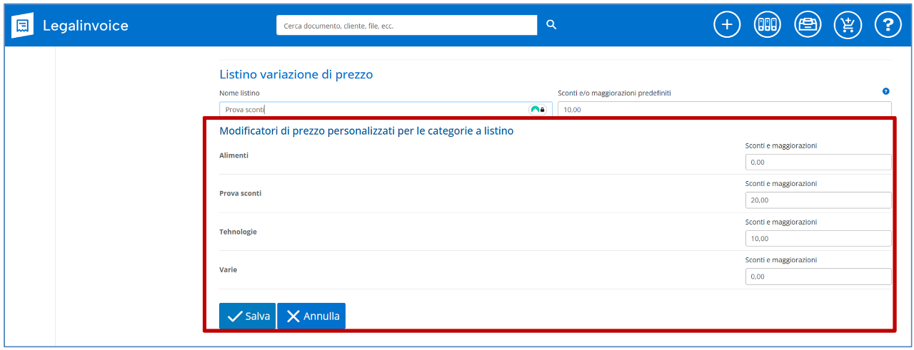 Lo sconto (o maggiorazione) sulle categorie riporta di default il valore del listino. E’ però possibile modificarlo, sovrascrivendo il valore desiderato.