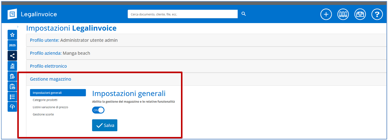 Inizialmente, è necessario abilitare la funzione Magazzino da Impostazioni – Gestione Magazzino.
