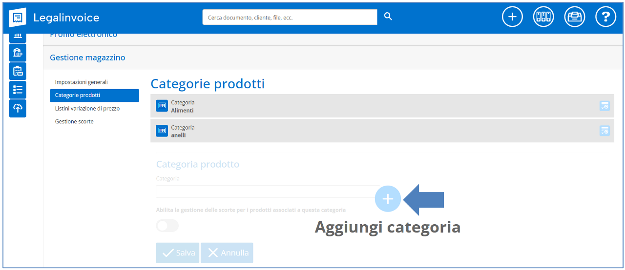 Cliccando sul “+” è possibile creare delle categorie per classificare i prodotti e rendere più semplice la gestione di sconti specifici per categoria merceologica.