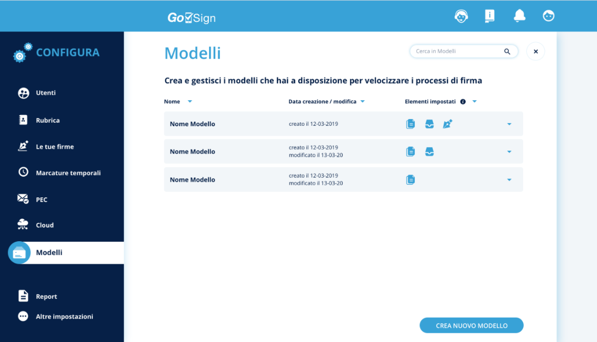 Nel menu laterale sarà disponibile la funzione "Modelli" che permette di accedere ad una maschera attraverso cui creare un nuovo modello/template. Cliccando sul button "Crea un nuovo modello", sarà possibile semplificare i processi di firma, impostando: