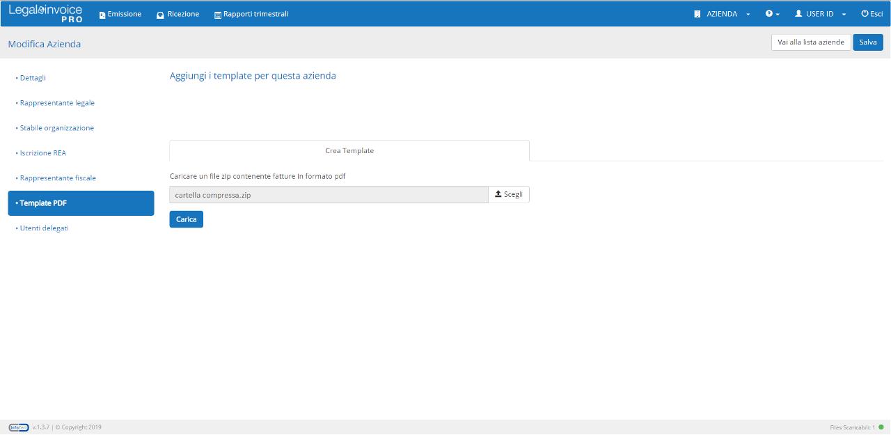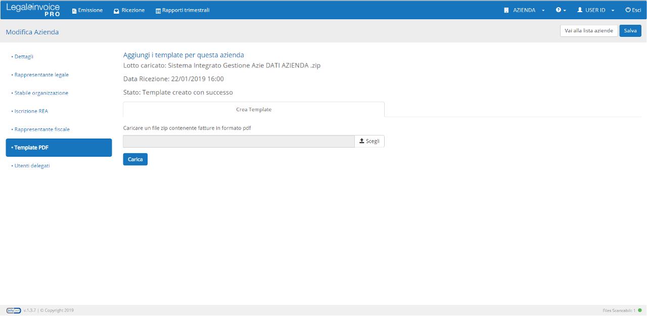 Posso verificare l'avvenuto caricamento rientrando nell'area Modifica Azienda e controllando la disponibilità dei Template PDF.