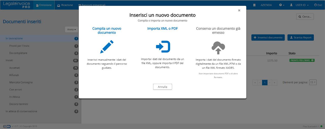 Legalinvoice PRO mi propone un pannello di dialogo all’interno del quale seleziono la voce Importa XML o PDF.