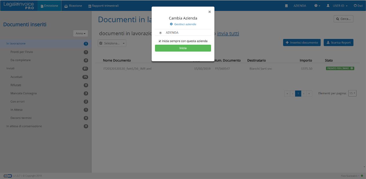 A questo punto accedo a Legalinvoice PRO e, una volta all’interno, procedo con un clic sul nome della mia azienda che trovo inserito nella barra blu, in alto a destra.