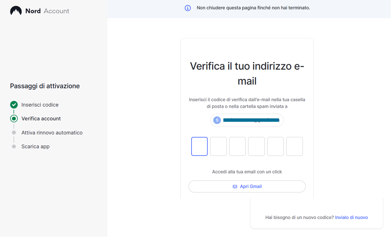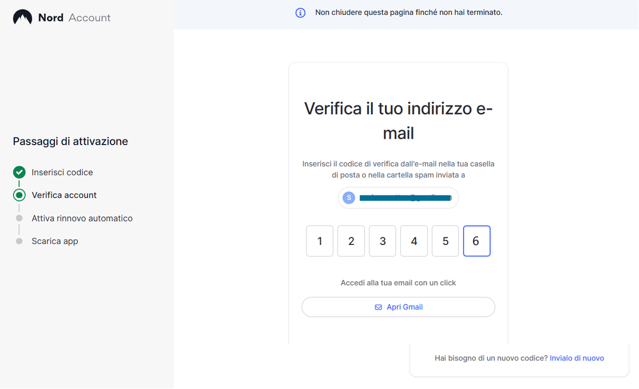 Per verificare l'indirizzo email inserito, inserisci il codice di verifica di 6 cifre ricevuto per email
