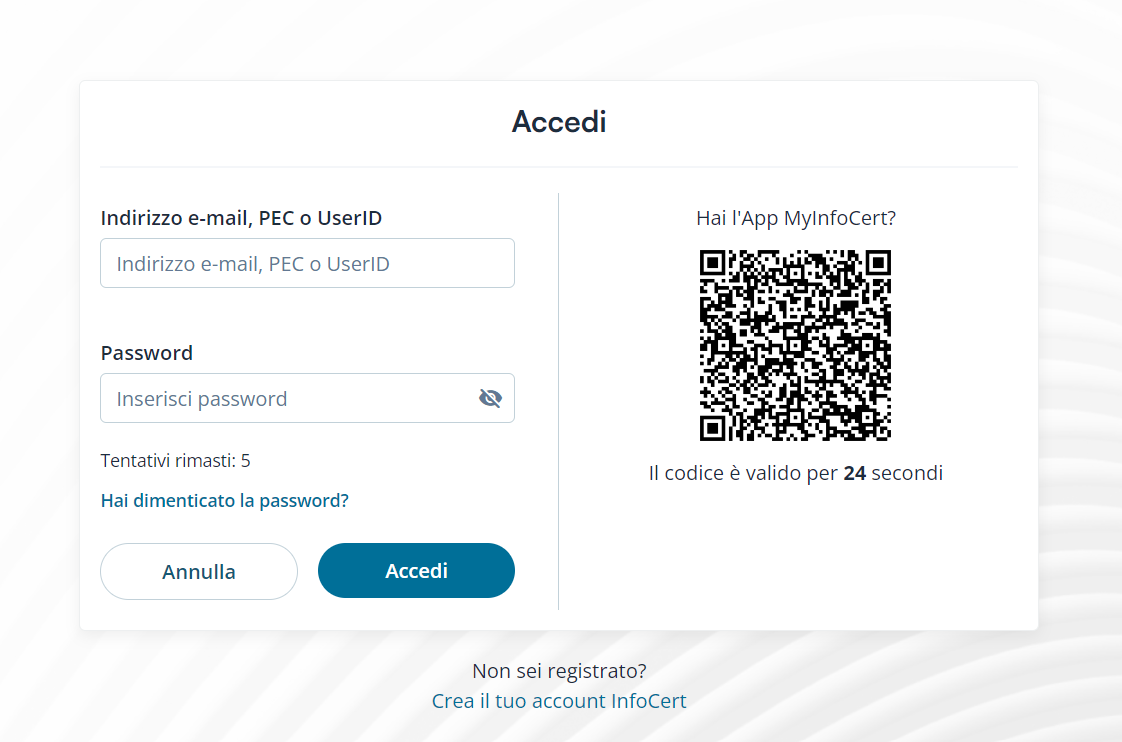 Per proseguire con il pagamento è necessario essere registrati sul sito Infocert. Se è la prima volta che fai un acquisto sul sito clicca sulla voce "Crea il tuo account InfoCert" per completare la registrazione. Se già disponi di un account InfoCert inserisci le credenziali associate per completare la login.