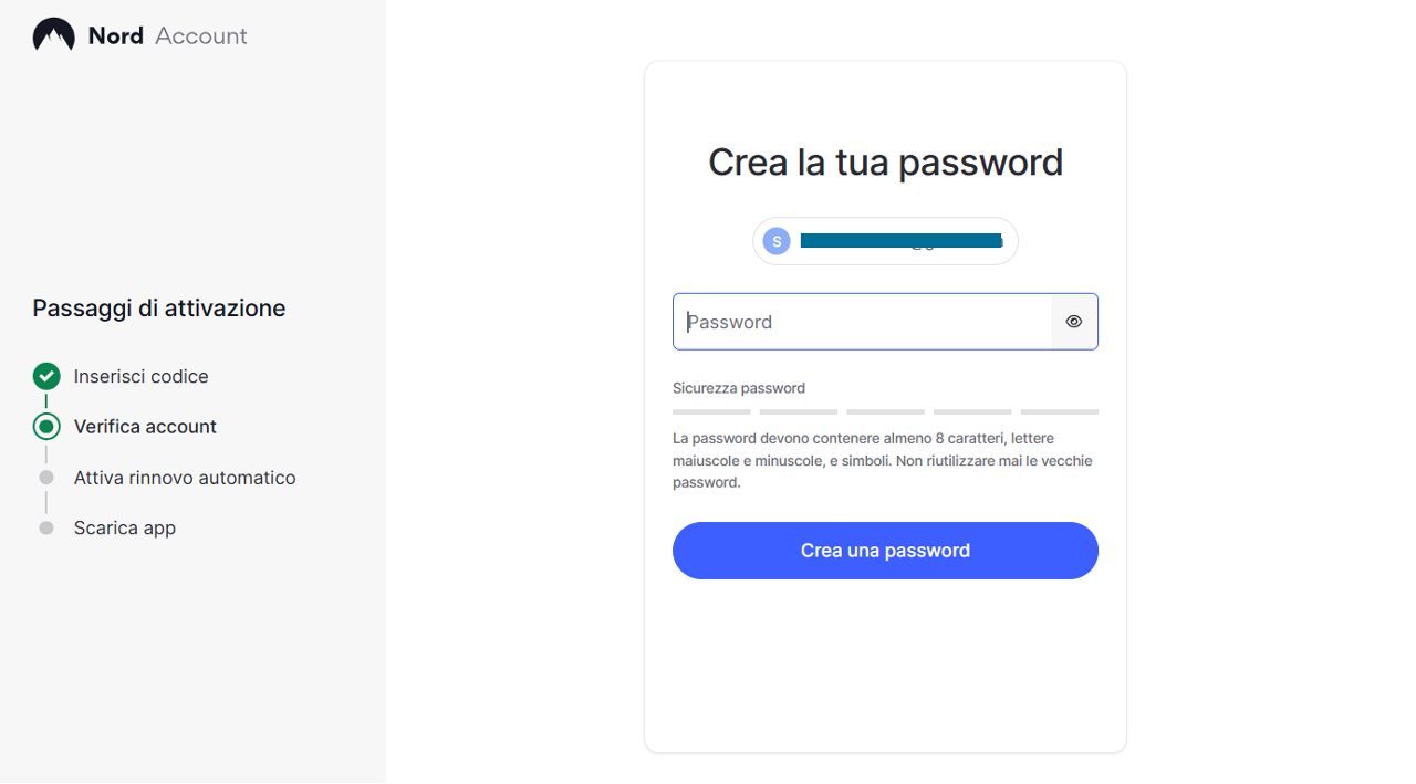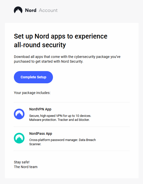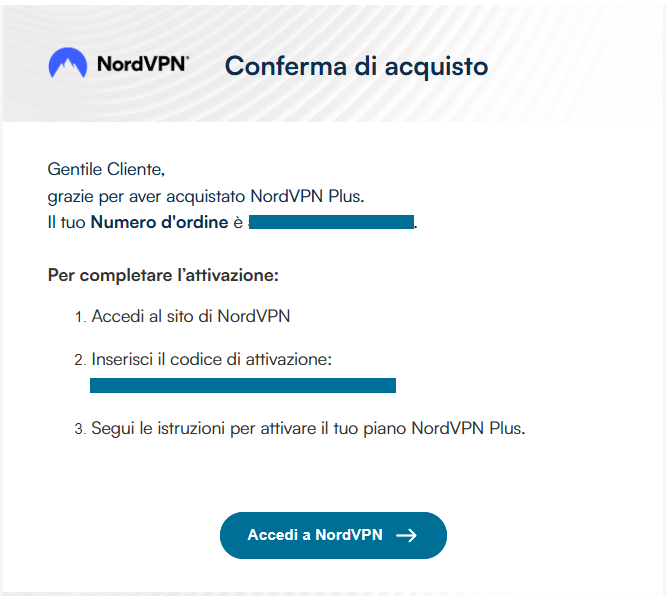 Oltre all'email di "Conferma acquisto" inviata da InfoCert, riceverai l'email da parte di NordVPN con al suo interno il pulsante "Complete Setup" che ti condurrà alla pagina per completare l'attivazione del servizio.