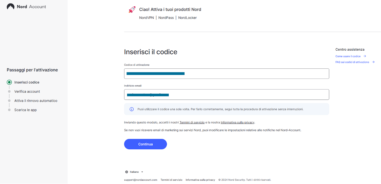Inserisci il codice di attivazione (*) e l'indirizzo email sul quale attivare NordVPN Plus.
