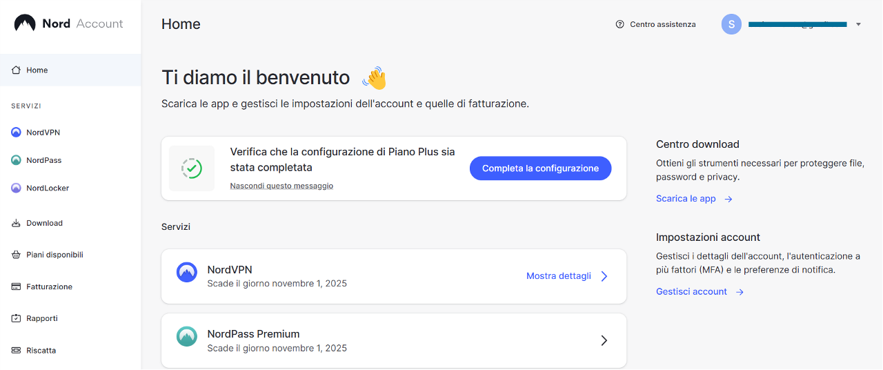 La schermata che ti si presenta davanti è la pagina Home del tuo account NordVPN con i servizi attivi e quelli da configurare.