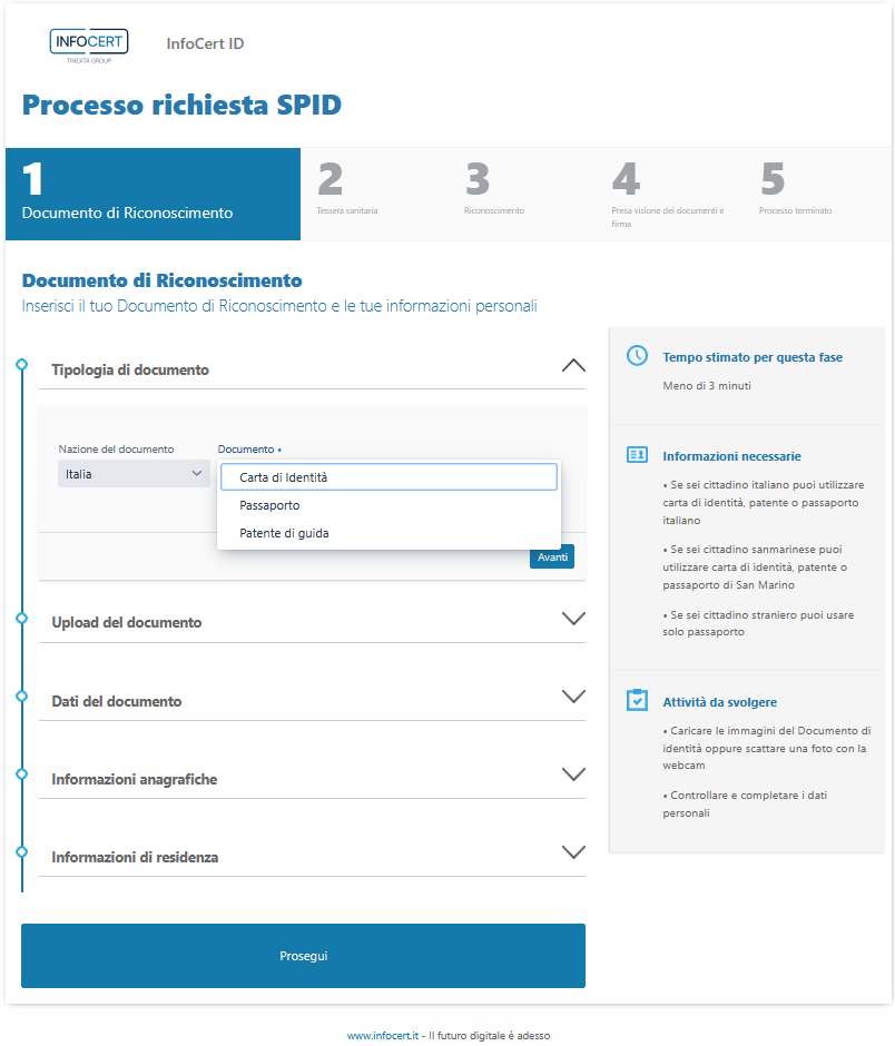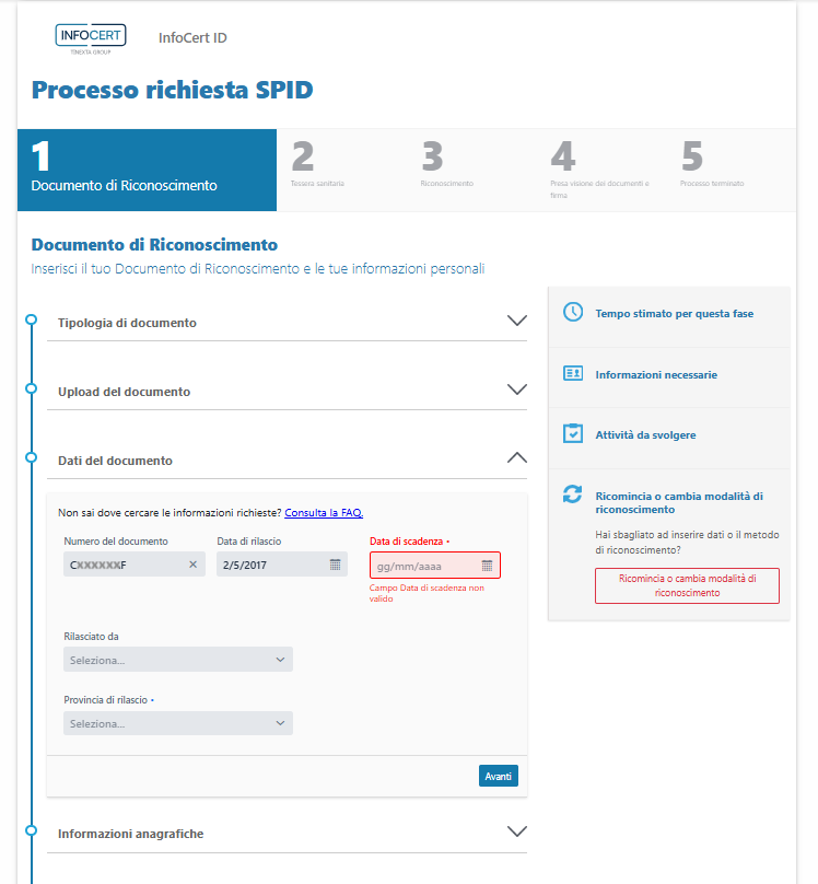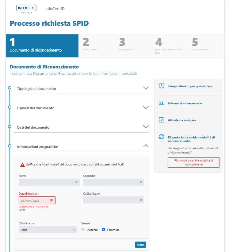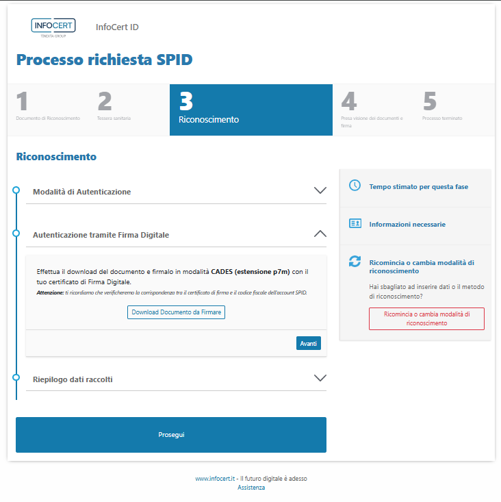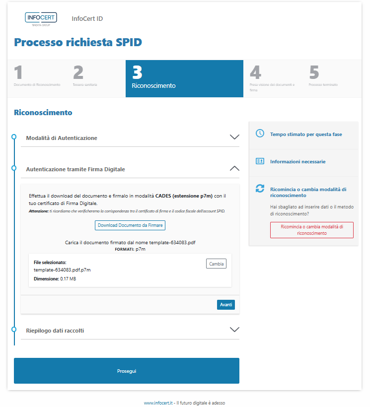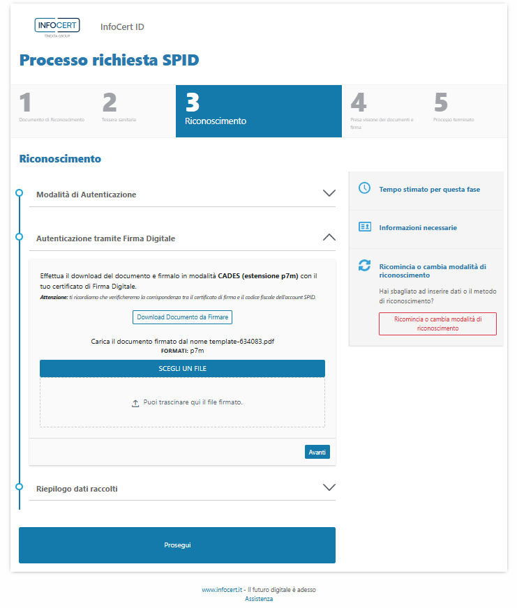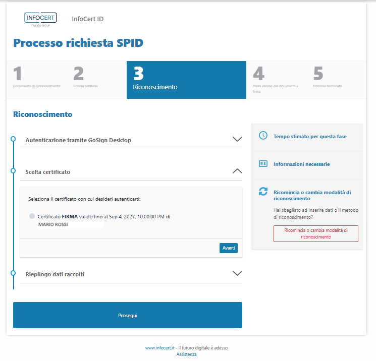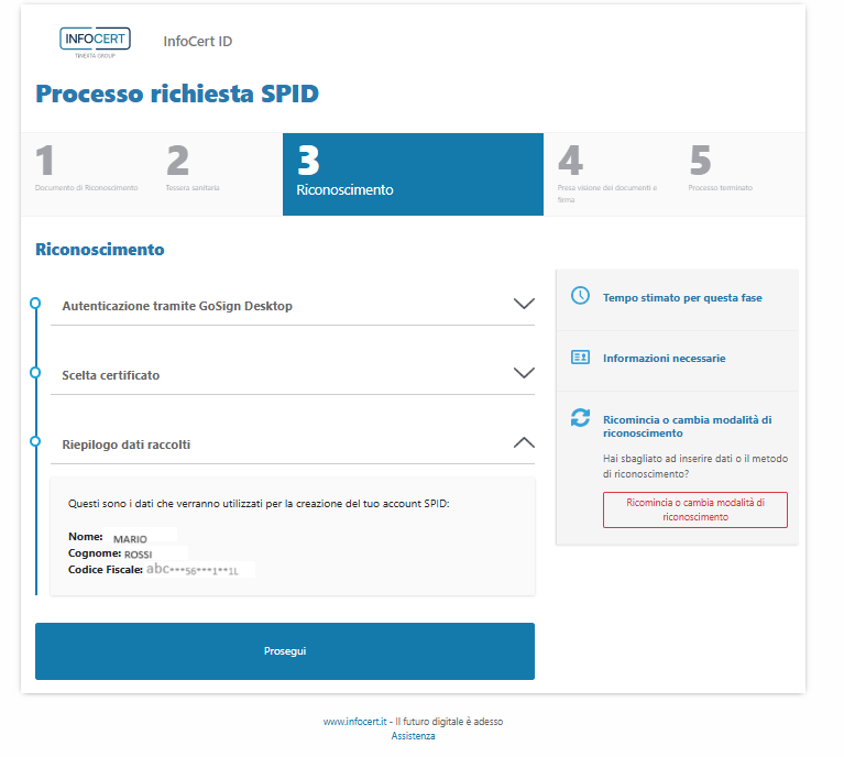 Anche in questo caso, i dati che verranno utilizzati per confermare l'identità e per creare la propria identità digitale compaiono nella sezione Riepilogo dati raccolti.
