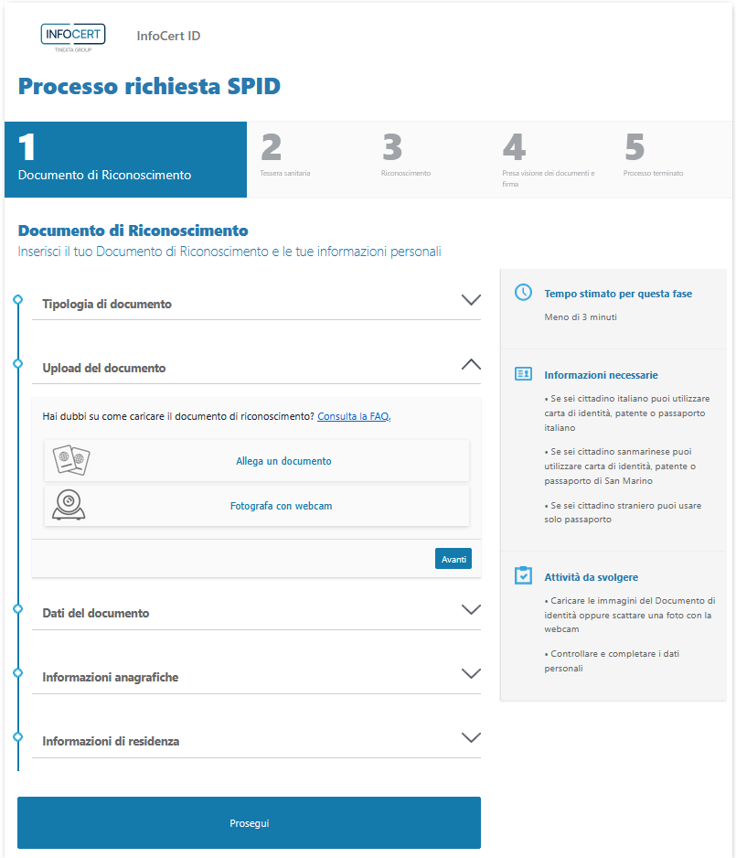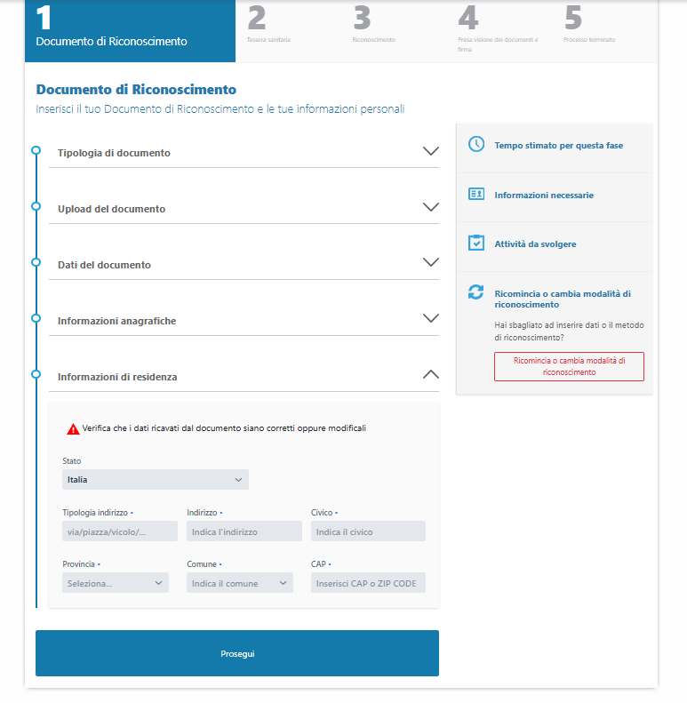 Se il documento utilizzato riporta i dati della residenza, allora anche questi si troveranno già disponibili nell'area Informazioni di residenza.