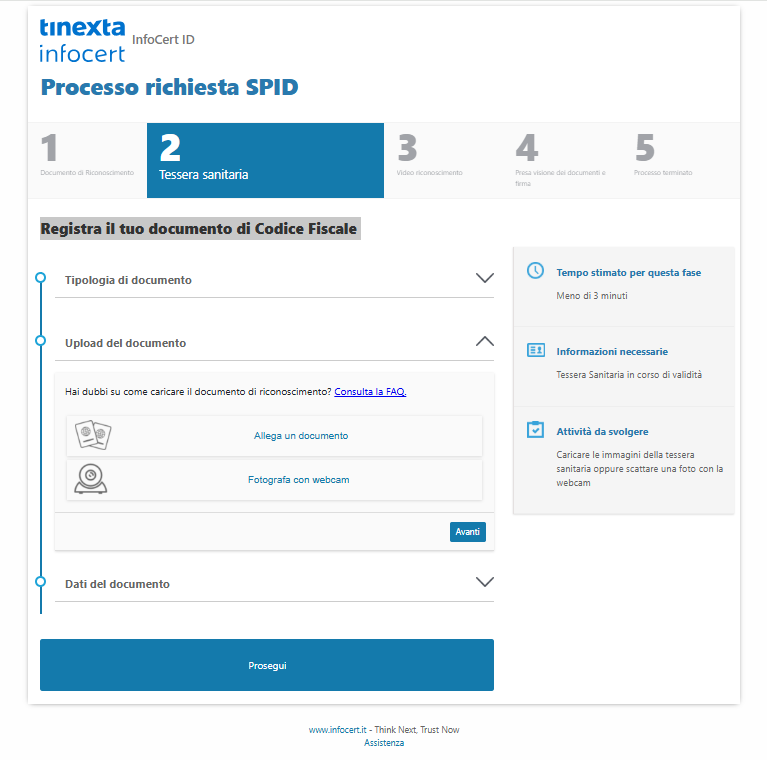 La Fase 2 consiste nel caricamento della Tessera Sanitaria la cui immagine può essere fotografata con la webcam del PC o allegata se già disponibile sul proprio computer.