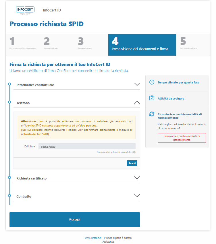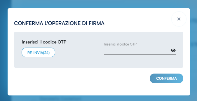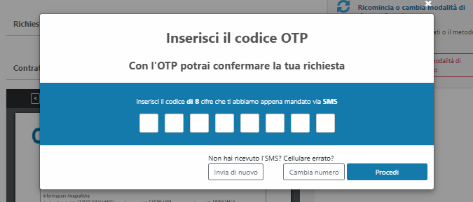 L'inserimento del codice OTP e la successiva convalida con un clic sul pulsante Procedi perfezionano la firma della documentazione contrattuale attraverso il certificato di firma One-Shot assegnato e completano il processo di richiesta.