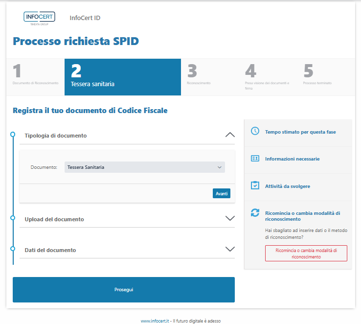 Se questo non è accaduto o se la documentazione in tuo possesso non fa espressamente riferimento alla fornitura di una CNS, la tessera sanitaria ti servirà esclusivamente per attestare l'attribuzione del codice fiscale ma non per il successivo riconoscimento dell'identità. Ti consigliamo pertanto di scegliere un'altra modalità di riconoscimento.
