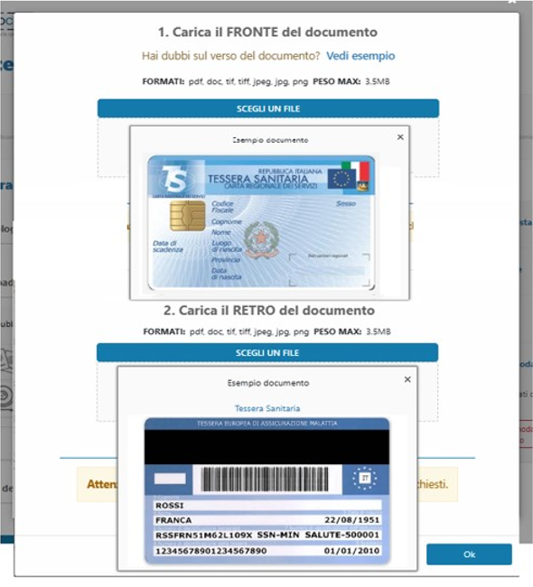 Una volta selezionato il tipo di documento, è previsto che se ne forniscano le immagini FRONTE e RETRO, fotografandolo con la webcam del PC o allegando le foto già scansionate presenti sul proprio computer.