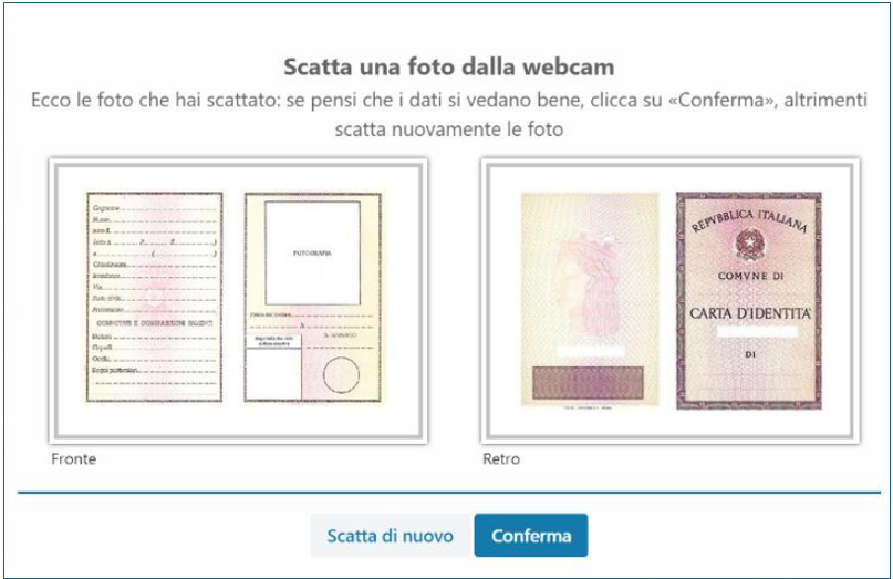 Una volta caricate entrambe le immagini (nell'es. una Carta d'Identità), verificarne l'esito ed eventualmente sostituire uno o entrambi i file caricati con un clic sul pulsante "Scatta di nuovo", oppure convalida il tutto con un clic sul pulsante Conferma.