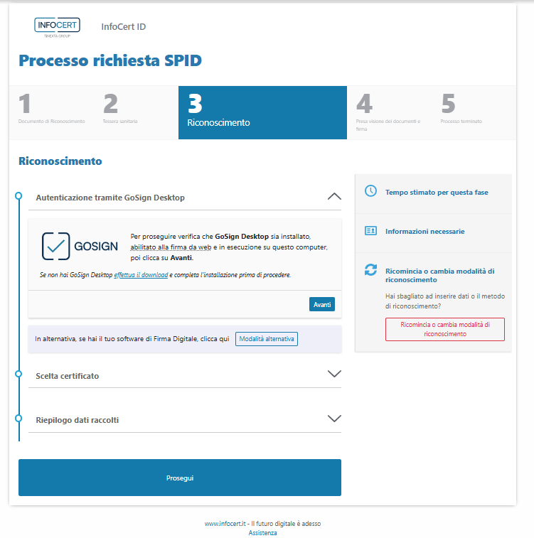 Se si è in possesso di un certificato di firma (remota o su dispositivo) non emesso da InfoCert e non si desidera utilizzare GoSign ma l'abituale software di firma, utilizzare la "Modalità alternativa" offerta dal sistema.